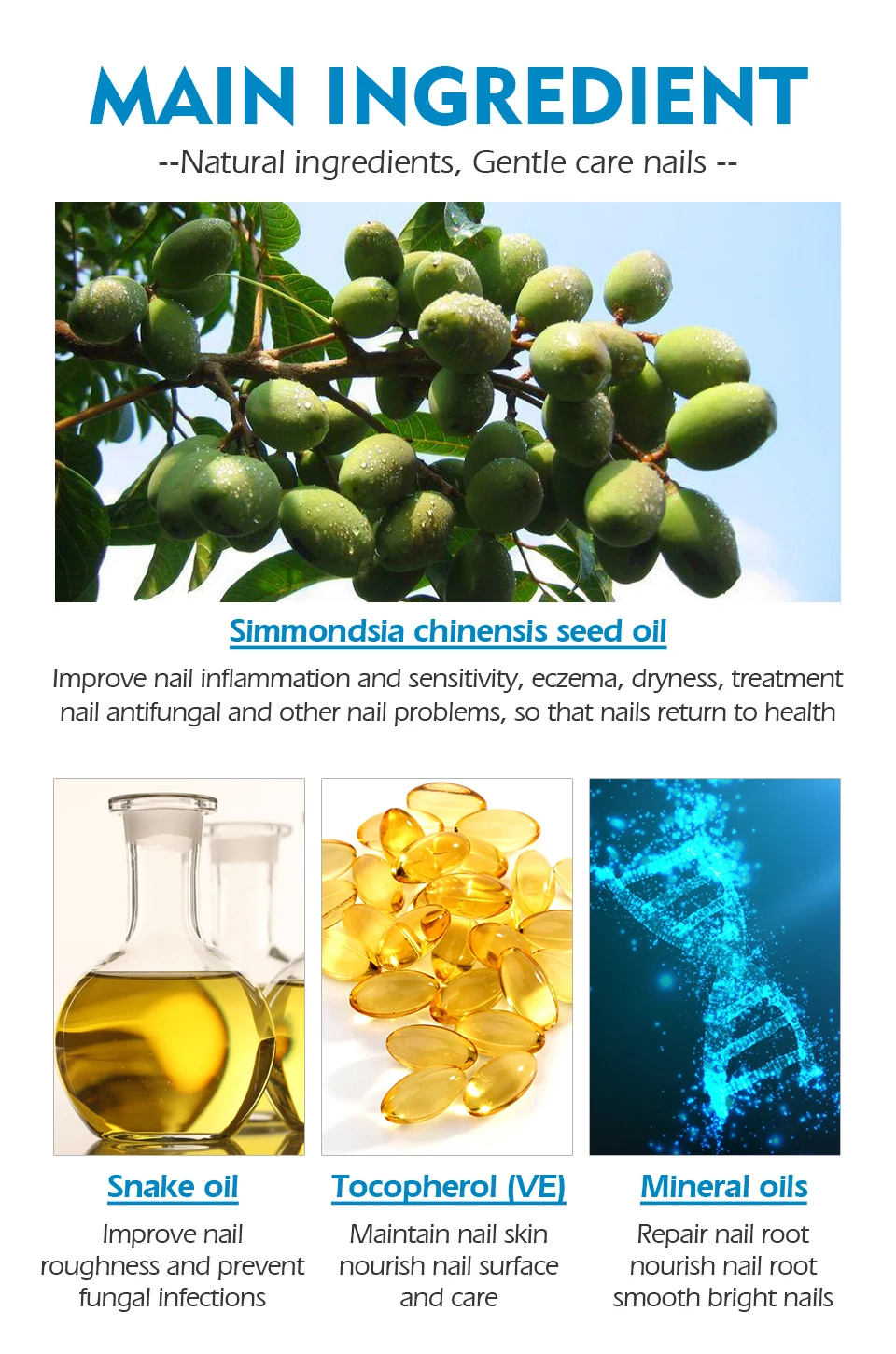 Основной ингредиент-натуральные ингредиенты, Бережный Уход за ногтями-симмондсия семена сумаха китайского улучшение для масла ногтевого воспаления и чувствительности, экзема, сухость, Лечение ногтей против грибков и других проблем с ногтями, так что ногти Возвращение к здоровью змея улучшение для масла шероховатости ногтей и предотвращения грибковых инфекций токоферол (VE) поддерживает питание для кожи ногтей поверхность ногтей и уход минеральные масла ремонт корня ногтей питание корня ногтей Гладкий яркий Гвозди
