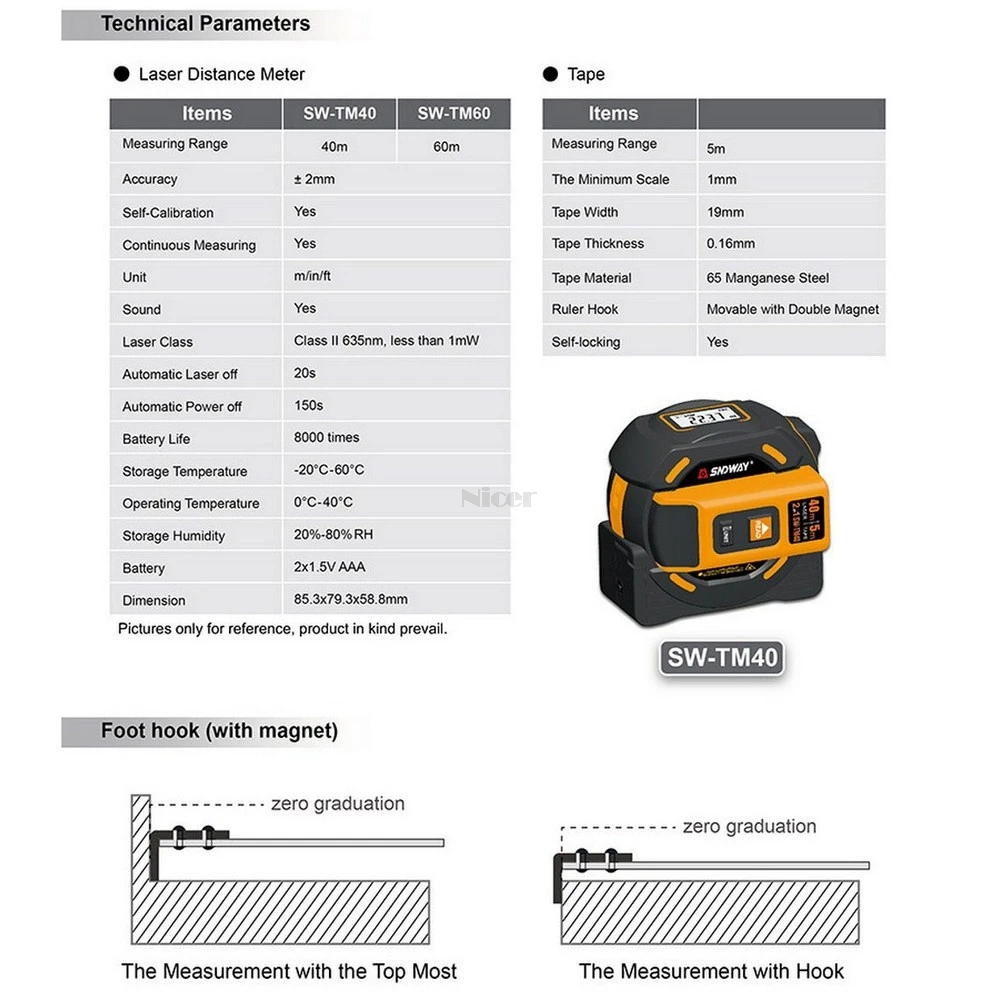 • Двойной режим: лазерный измеритель 40 м/60 м и измерение ленты 5 м