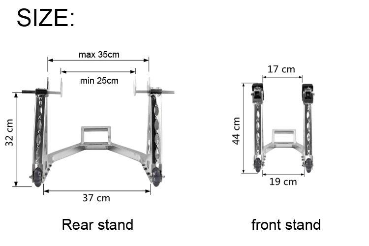 Название: Подставка для мотоцикла Бренд: HZYEYO Материал: алюминий Цвет: серебристый/черный Назначение: техническое обслуживание мотоцикла, фиксация рамы при очистке, экономия труда и удобная установка Передняя подставка: несущая 450 кг, регулировка головки 17 см Задняя подставка: несущая 450 кг, u-образная Регулировка 25 см ~ 35 см