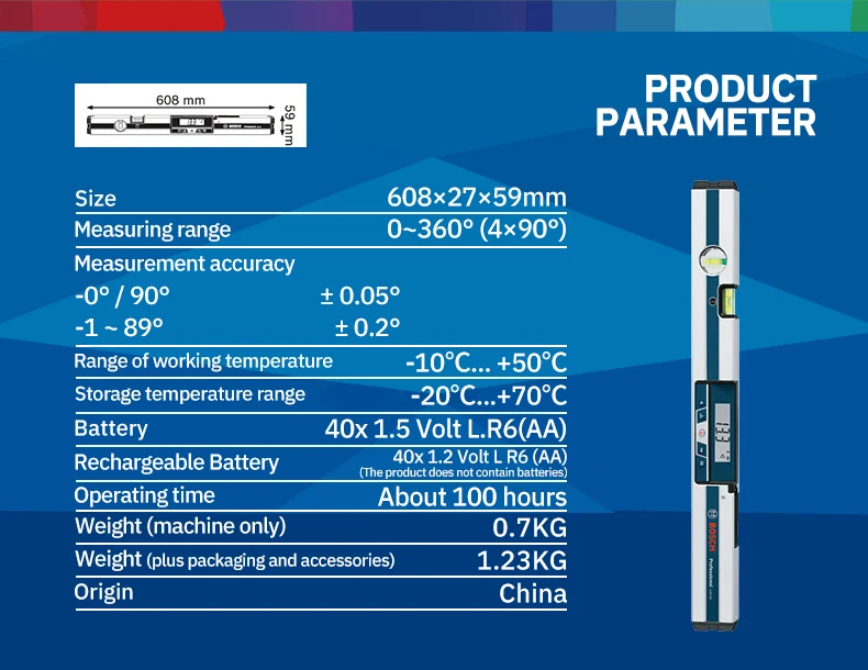 Размер 608*27*59 мм Диапазон измерения 0-360 ° (4x90 °) Точность измерения-0 ° /90 ° + 0,05 ° -1-89 ° + 0,2 ° Диапазон рабочих температур-10 ℃... + 50 ℃ Диапазон температур хранения-20 ℃...+ 70 ℃ Аккумулятор 40x1,5 Вольт L.R6(AA) Перезаряжаемая батарея 40x1,2 Вольт L R6 (AA) (батарейки в комплект не входят) Время работы около 100 часов Вес (только машина) 0,7 кг Вес (упаковка и аксессуары) 1,23 кг Произведено в Китае