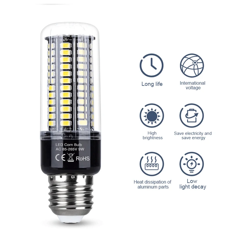 Название продукта: светодиодный светильник Материал: алюминиевая подложка + PS тепловой щит Светодиодный светильник: 40/72/108/132/156/189 (шт) Угол луча: 360 (градусов) Характеристики лампы: E27 Индекс цветопередачи: 80 Мощность: 5 Вт/7 Вт/9 Вт/12 Вт/15 Вт/20 Вт Входное напряжение: 85-265 (В) Световой поток: 328-1380 (лм) Светильник Цвет: белый/теплый белый Особенности: 100% новый и высокое качество! Новое поступление, 5730 SMD Светодиодная кукурузная лампа, ярче, чем старый 5730 SMD светильник Высокая эффективность энергосбережения, низкое нагревание производства. Низкое энергопотребление и экономит нашу планету больше энергии. Высокая освещенность и длительный срок службы. Легко установить, просто заменить, удобно использовать. Очень подходит для дома, магазинов, офисов, студий, ландшафтного освещения, архитектурного освещения, развлекательного освещения, ресторанов, гостиниц, окружающего освещения, художественных галерей, выставочного освещения и т. д.