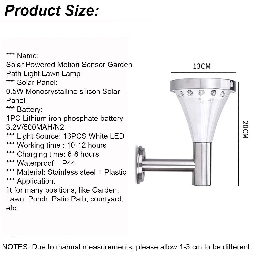 *** Название: на солнечной энергии датчик движения Сад Путь Свет Газон лампа *** Панель солнечных батарей: 0,5 W панель солнечной батареи из монокристаллического кремния *** Аккумулятор: 1 шт. литий-железо-фосфатный аккумулятор 3,2 V/500MAH/N2 *** Источник света: 13 шт. белый светодиод *** Время работы: 10-12 часов *** Время зарядки: 6-8 часов *** Водонепроницаемый: IP44 *** Материал: нержавеющая сталь + пластик *** Переключатель: Автоматическое/выключение *** Применение: подходит для многих позиций, таких как сад, газон, веранда, патио, дорожка, внутренний двор и т. д.