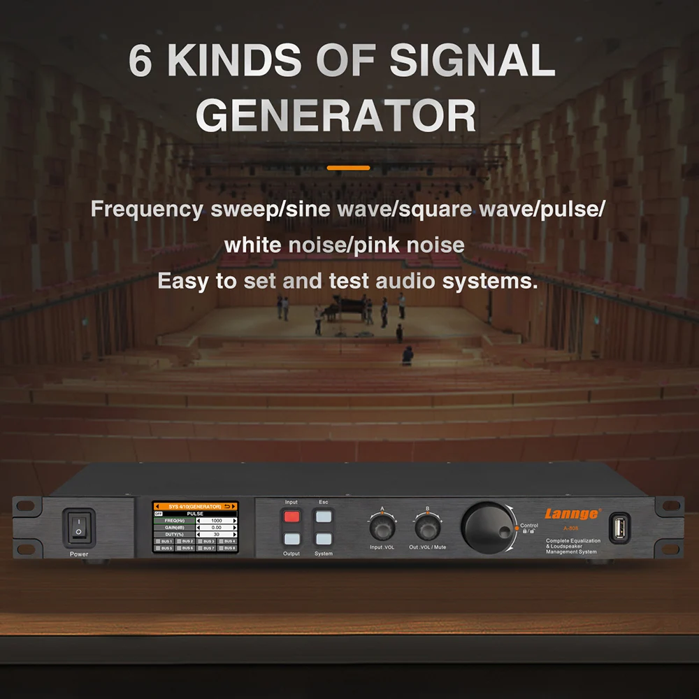 Высокая мощность, плавающий десятичный 32 бит DSP, делает частотный диапазон более широким и динамическим диапазоном больше; 6 генератор сигналов: Частотная развертка, Синусоидальная волна, квадратная волна, пульс, белый шум, розовый шум, легко установить и протестировать аудиосистему.
