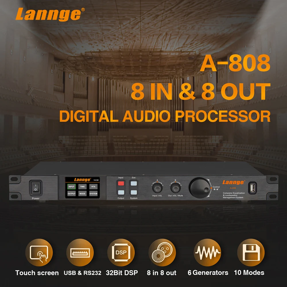 8 IN & 8 OUT цифровой аудиопроцессор с 2,75 дюймовым цветным сенсорным экраном, прост и удобен в эксплуатации и подходит для многофункциональных аудиторий, этапов, пабов, больших конференц-залов и т. д.