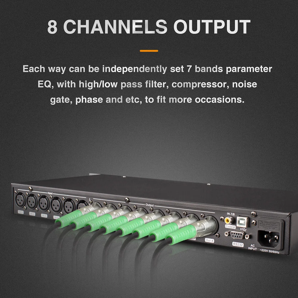 8 выходов, каждый способ может быть самостоятельно установлен 7 диапазонов эквалайзера параметров, с высоким/низким проходом фильтра, компрессора, фазы и т. Д., чтобы соответствовать больше случаев.