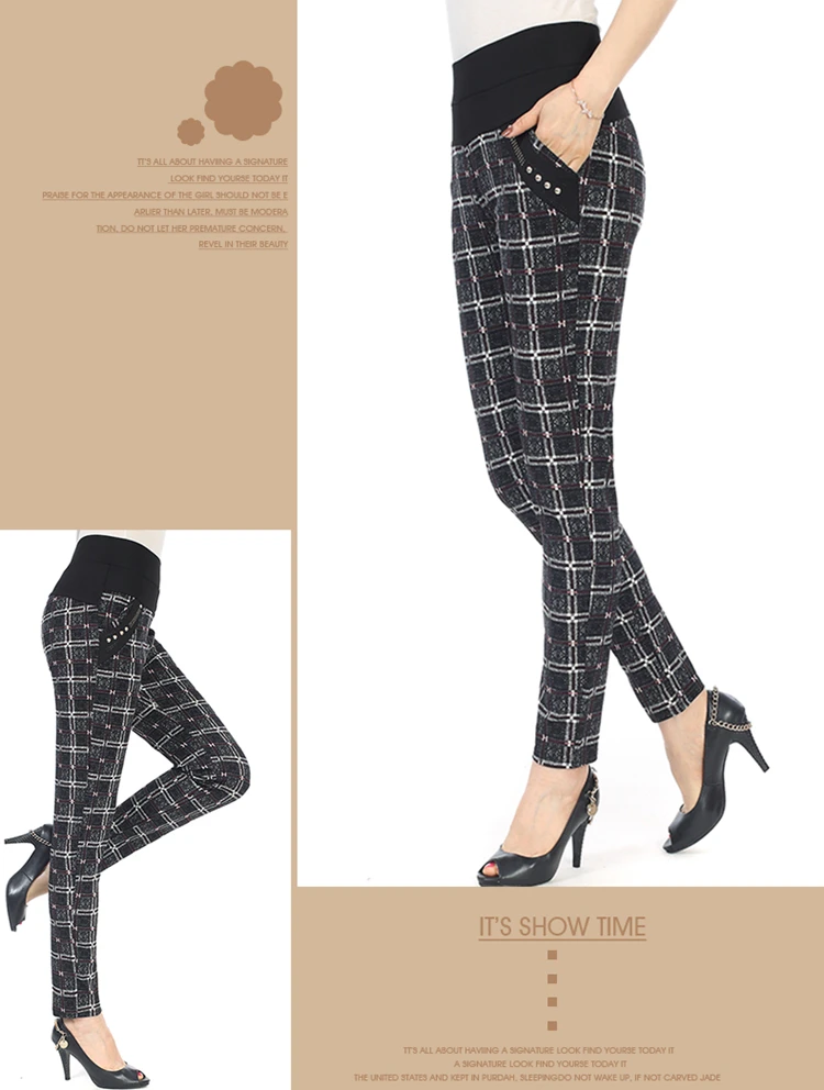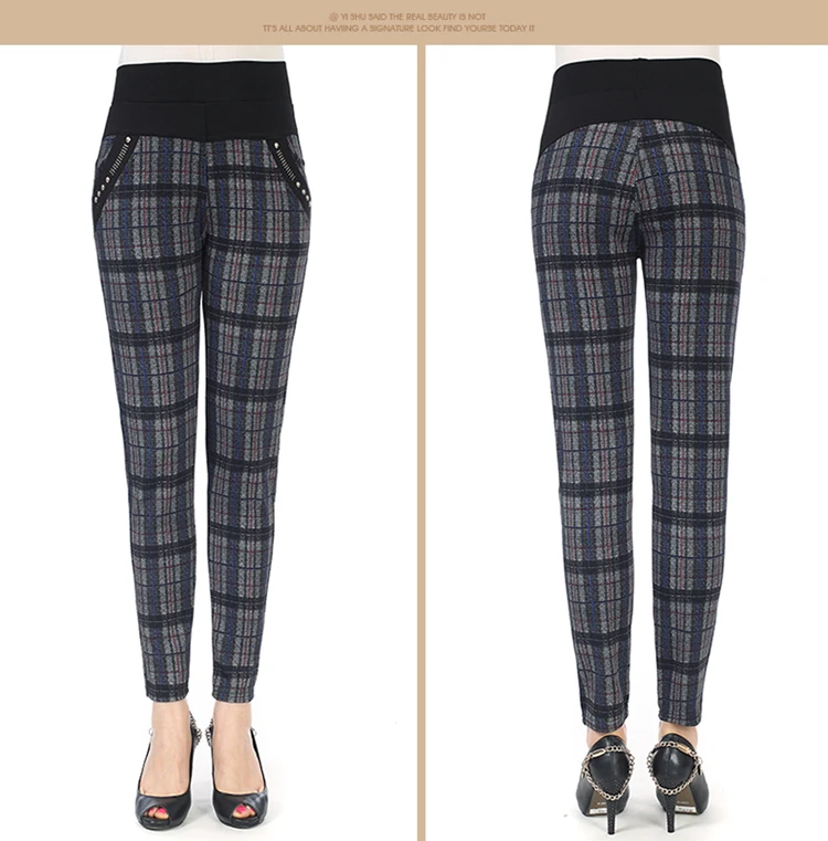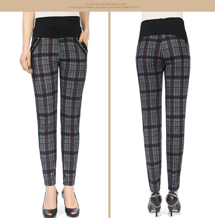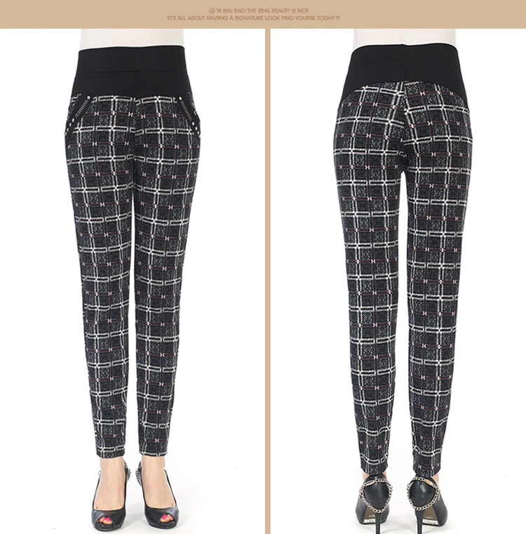 Женские брюки-карандаш в клетку, теплые бархатные узкие брюки размера плюс с высокой талией, calca feminina, Осень-зима 2019
