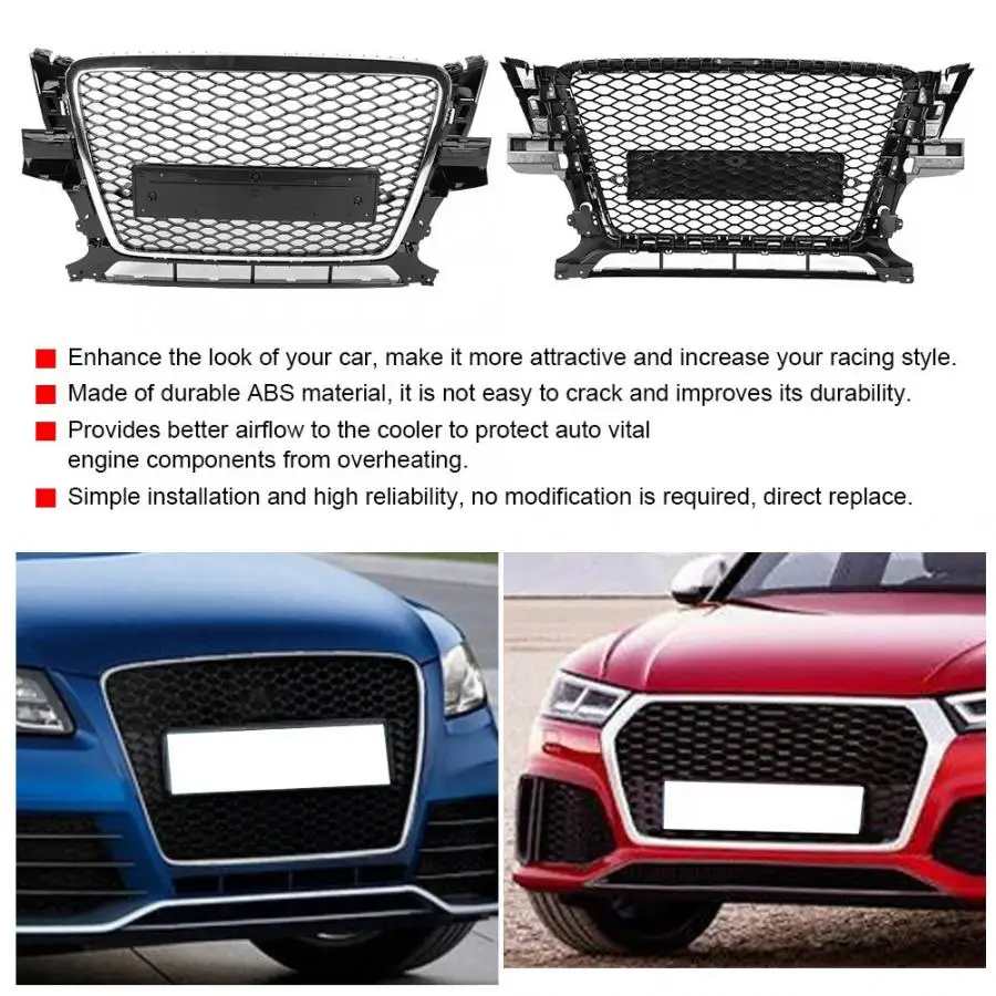 Улучшите внешний вид вашего автомобиля, сделайте его более привлекательным и Увеличьте свой гоночный стиль. Изготовлен из прочного АБС-материала, не легко трескаться и улучшает его долговечность. Обеспечивает лучший поток воздуха в охладитель для защиты компонентов двигателя от перегрева. Простая установка и высокая надежность, никаких модификаций не требуется, прямая замена. Подходит для Q5/SQ5 8R 09-12.