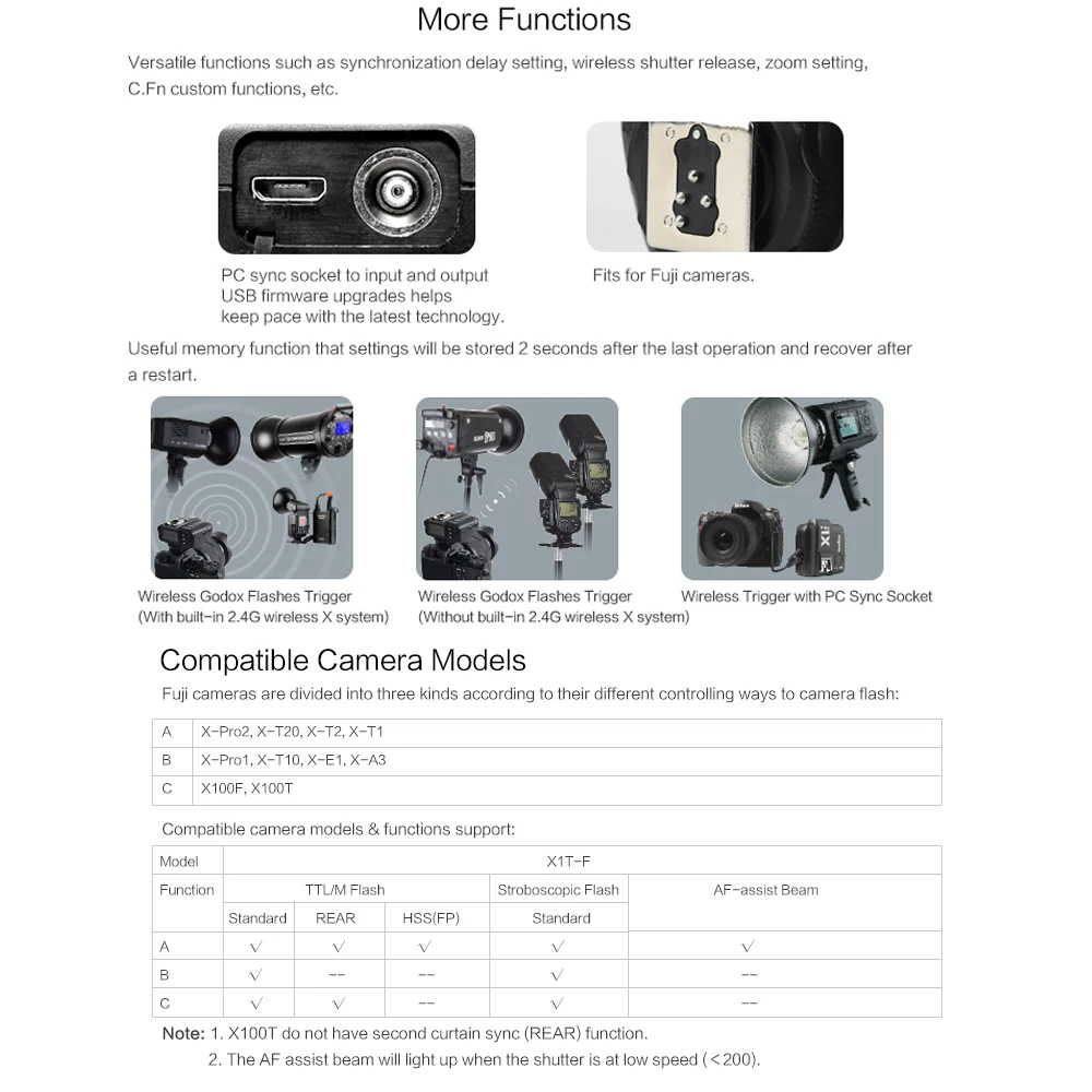 Эта вспышка TT600 принимает беспроводную x-систему Godox, со встроенной беспроводной передачей 2,4G, ее можно использовать с вспышкой Godox AD360II-C/AD360II-N, TT685C/TT685N, триггер X1T-C/X1T-N и другие устройства с беспроводной системой управления. При использовании с беспроводным триггером вспышки Godox X1 ttl, он может осуществлять дистанционное управление, высокоскоростную синхронизацию и другие функции, сделать вашу съемку проще и проще. Он может совместим с большинством брендовых камер, таких как Canon Nikon Pentax Olympus Fujifilm Panasonic и других цифровых камер со стандартным горячим башмаком. Он оснащен оптической передачей и беспроводной передачей 2,4G, обеспечивает равномерное освещение и стабильную выходную мощность, обеспечивая более выдающийся светильник. Особенности -Принимает беспроводную систему X Godox, со встроенной беспроводной передачей 2,4G, может использоваться с системой беспроводного управления Godox AD360II-C/AD360II-N, TT685C/TT685N, X1T-C/X1T-N. -Встроенная беспроводная передача 2,4G с функциями «Все-в-одном» и дальней передачей 100 метров обеспечивает стабильный выход и креативный светильник. -Превосходная производительность: больше времени вспышки, около 230 вспышек полной мощности (с использованием никель-металл-гидридных аккумуляторов 2500ма), обеспечивают достаточно времени вспышки для вашей съемки. -Более быстрое время переработки: 0,1-2,6 с время переработки на полной мощности (с использованием никель-металлогидридных аккумуляторов eneloop Panasonics). -Освещение даже светильник: GN60 (m ISO 100) Высокое направляющее число, 1/300 s-1/20000 s короткая продолжительность вспышки, 5600±200K стабильная цветовая температура. -Большой размер ЖК-панели, чтобы предложить четкую и удобную работу. -При использовании с беспроводным триггером вспышки X1 ttl (продается отдельно), может дистанционно запускать вспышку TT600 и управлять ручным выходом, обеспечивая лучший пользовательский опыт. -Высокоскоростная синхронизация (HSS): Возможна Высокоскоростная синхронизация при использовании с триггером Godox Cell-II или беспроводным триггером X1C/X1N ttl (продается отдельно), максимальная скорость может достигать 1/8000 s (зависит от камер). это особенно удобно при использовании диафрагмы для заполнения вспышки на портрете. Обратите внимание: TT600 не может осуществлять HSS при использовании на горячий башмак камеры. -Поддержка режимов M/S1/S2, автоматическое/Ручное Масштабирование 20-200 м. -С C. Fn настройки пользовательских функций. -С функцией автоматической защиты от перегрева вспышки. Технические характеристики: Торговая марка: Godox Модель: TT600 Направляющий номер (1/1 мощность при 200 мм): GN60 (m ISO 100) Вертикальный угол поворота:-7 ° ~ 90 ° Угол поворота по горизонтали: 0 ~ 360 ° Источник питания: никель-металл-гидридные батареи (рекомендуется) или 4 * LR6 щелочные батареи Время вспышки полной мощности: около 230 раз (используется никель-металл-гидридный аккумулятор 2500 мА) Время использования: около 0,1 ~ 2,6 секунд (для eneloop ni-mh батарей Panasonic б/у) Индикатор готовой вспышки: красный светодиодный индикатор будет светильник, когда вспышка будет готова Длительность импульса: 1/300 s-1/20000 s Цвет Температура: 5600K±200K Беспроводная Функция: Master, Slave, Off Управляемые рабочие группы: 5 (A, B, C, D, E) Дальность передачи (прибл.): 100 м (2,4G беспроводной) Канал: 1 ~ 32 Размер товара: 6,4*7,6*19 см/2,5*3 * 7.5in Вес изделия: около 14,1 г/унций Посылка Размеры: 9*8*20 см/3,5*3,2 * 7.9in Вес посылка: 527 г/18,6 унций Модель: 