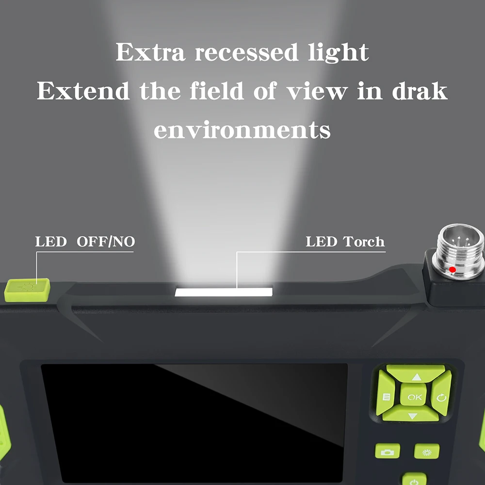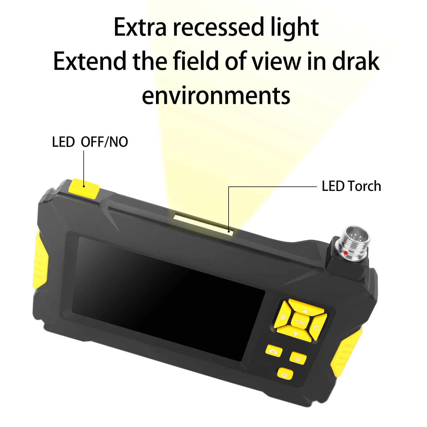 Монитор: 4,3-дюймовый цветной ЖК-дисплей Разрешение камеры: 1920*1080P Горизонтальный угол обзора: 70 ° Язык: 11 языков Длина линии: 2 м 5 м 10 м на выбор Фокусное расстояние: 4 см-500 см Водонепроницаемый уровень: IP67 Диаметр объектива: 3,9 мм Емкость аккумулятора: 2600 мАч Время работы: 5-7 часов