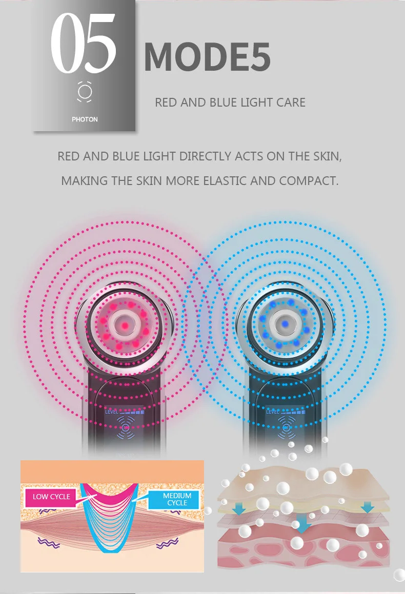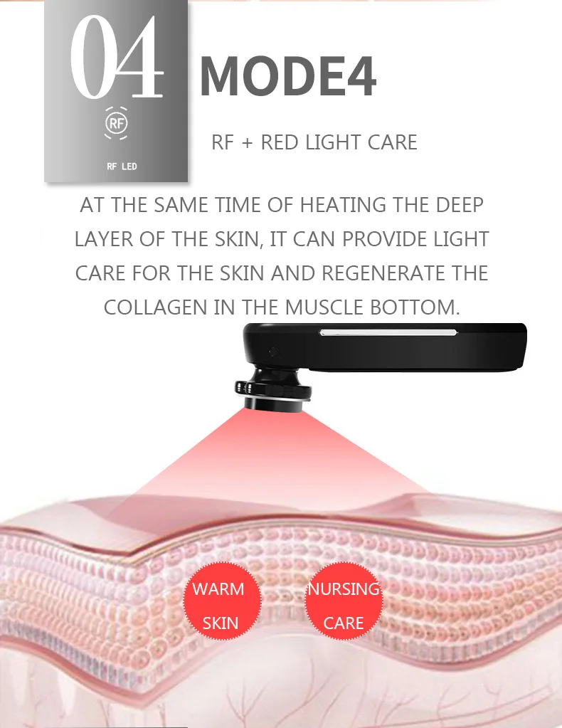 4. RF + красный светильник. В то же время, нагревая глубокий слой кожи, он может обеспечить светильник для ухода за кожей и регенерировать коллаген в нижней части мышц.
