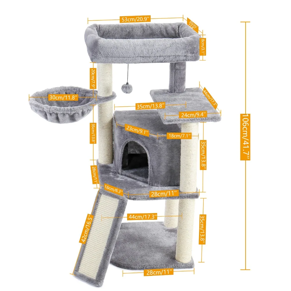 ·Многофункциональность: мягкие плюшевые кондо и гнездо предлагают тихое место, чтобы свернуться, чтобы повторить сон с чувством безопасности. Полностью завернутые столбы из натурального сизаля и доска обеспечивают большую площадь для ваших кошачьих друзей, чтобы заточить ногти и освободить естественные инстинкты.