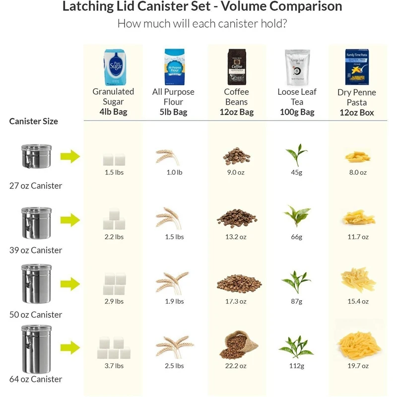 Канистра с защелкой крышки: Премиум 18/10 канистры наборы для любой кухни с чистым современным видом. Я идеально подходит для чая, кофе, сахара или хранения продуктов. Акриловые крышки, устойчивые к нагреву и разрушению, с силиконовыми прокладками для герметичного уплотнения.