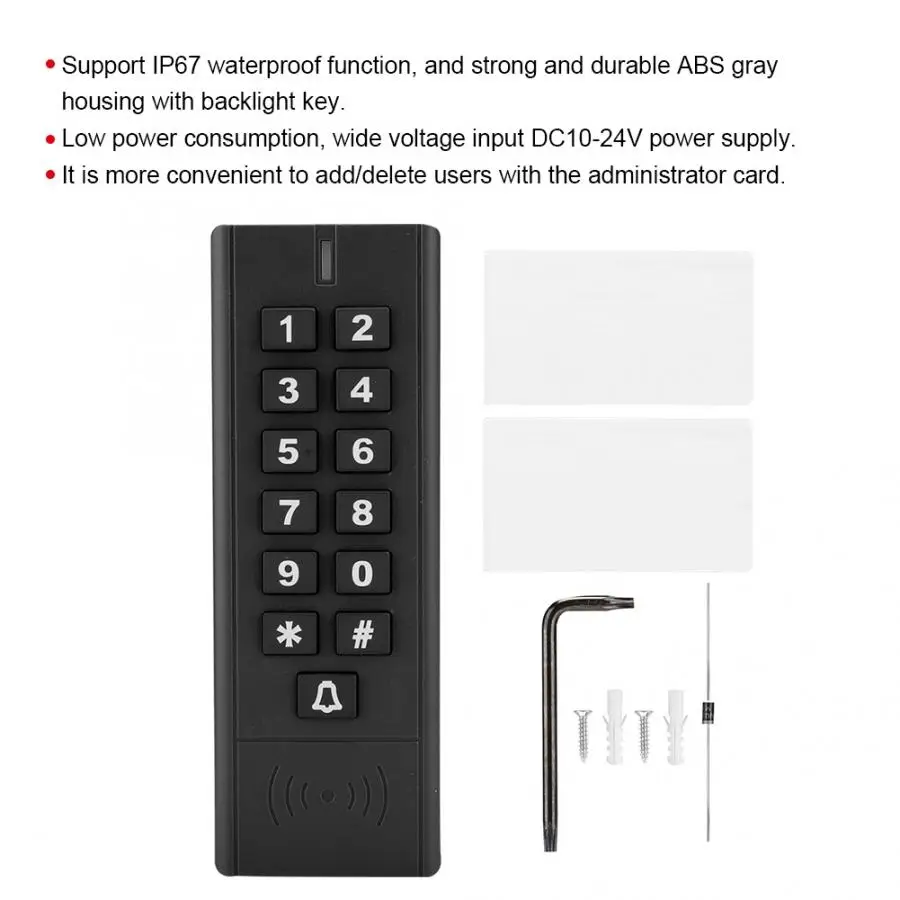 Этот товар представляет собой многофункциональный водонепроницаемый аппарата контроля доступа, чтения ID карты (125 кГц), 1000 пользовательская, 4-6 цифр, оснащенный администратора карты, быстрое Добавление/удаление пользователей с помощью аварийной сигнализации. Он также имеет аварийную сигнализацию, взрывозащищенные и анти-Подводные функции.