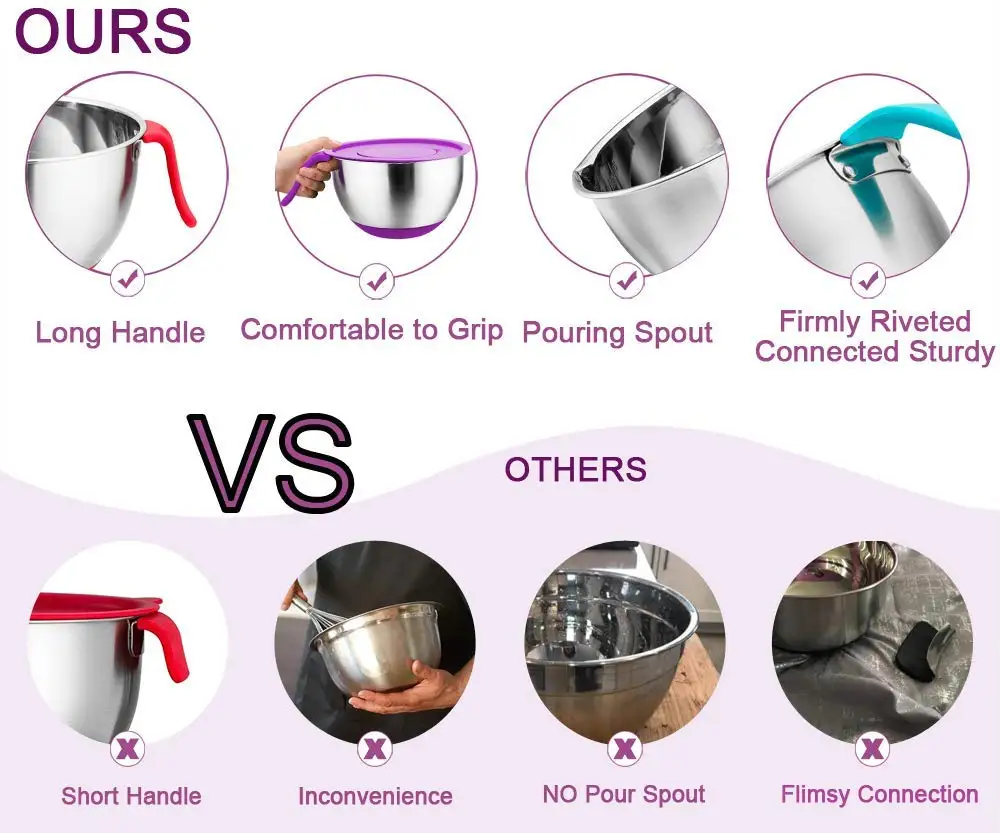 Набор чаш для смешивания оснащен нескользящей Силиконовой основой, что делает эти чаши невероятно стабильными во время смешивания/перемешивания. Нескользящие длинные мягкие силиконовые ручки позволяют легко захватывать чаши. Больше не использовать только кончики пальцев или обернуть руки вокруг чаши .. Нескользящее Силиконовое дно гарантирует, что чаши будут оставаться на месте, когда вы смешаете. Носик без разлива позволяет легко высыпать смесь прямо из миски для смешивания.