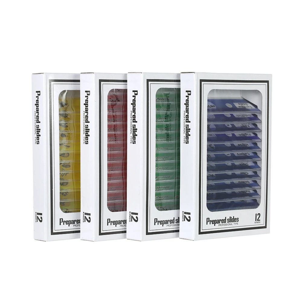 Набор из 48 слайды подготовленные для микроскопа, упакованы в 4 коробки, включает растения, насекомых и животных тканей.