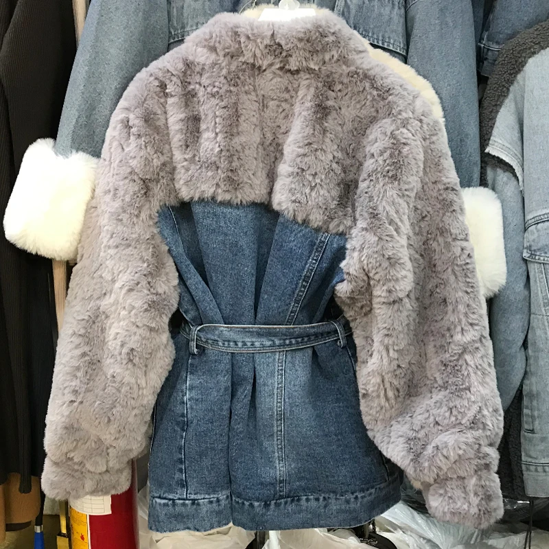 Женская джинсовая облегающая куртка с искусственным мехом на зиму и осень, Женская Теплая стеганая куртка с регулируемой талией, ветровка