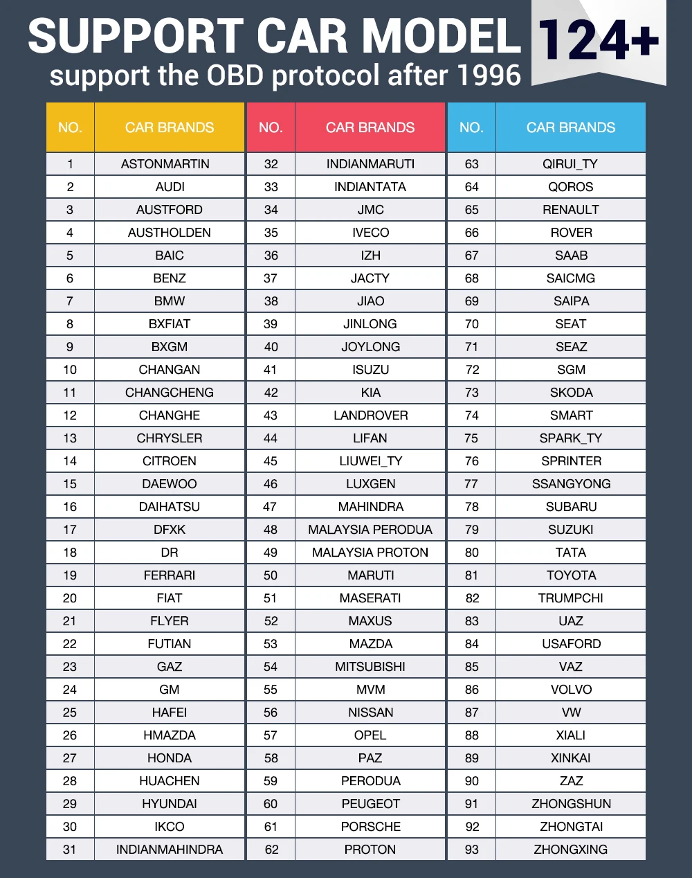 ThinkCar ThinkScan Max поддерживает около 124 списка программного обеспечения для автомобиля: