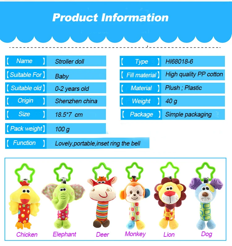 Название продукта: детская погремушка Упаковка: мешок Материал: высококачественный короткий бархат с защитой окружающей среды Размер: высота около 18 см Характеристики продукта: Каждое животное имеет устройство BB в руке. Материал-мягкая кожа. Яркие цвета. Дизайн животного-это новый, Функция: способствует развитию слуха, зрения и касания ребенка С устройством BB (устройство BB не является громким, чтобы не влиять на развитие слуха ребенка)