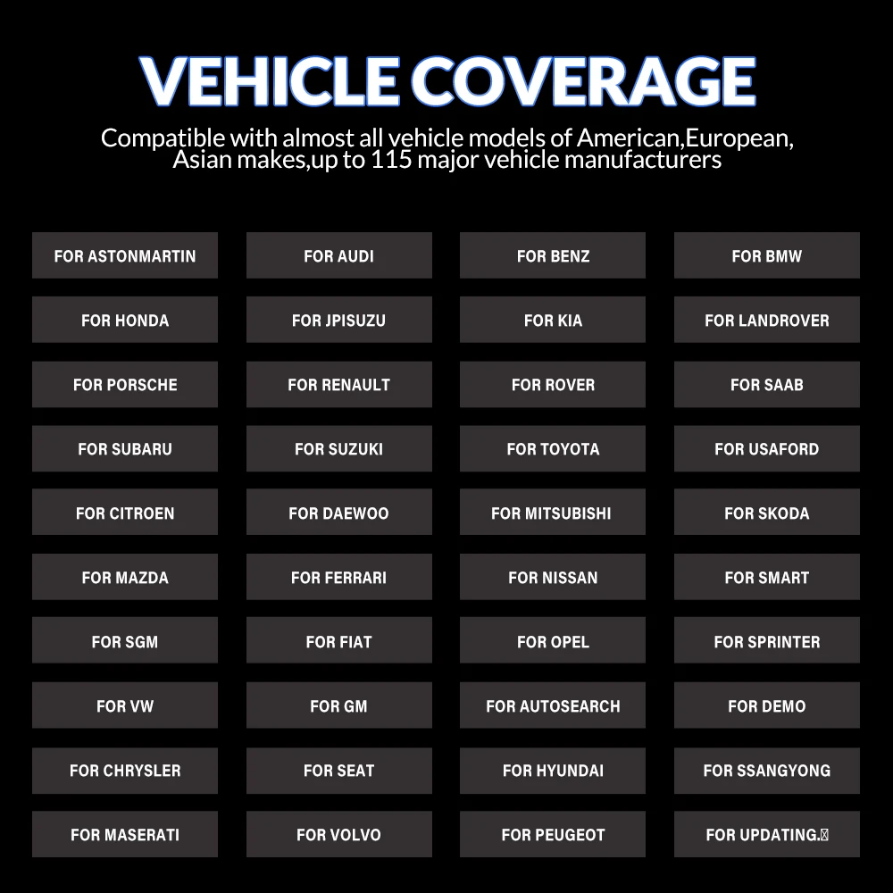 Для диагностики OBDII устройство считывания кодов obd2 отлично подходит для большинства автомобилей, построенных в 1996 году или более поздней версии, совместимо со следующими протоколами: -ISO 14230-4 (KWP2000) -ISO 15765-4 (CAN) -ISO 9141-2 (iso) -ISO 14229 (uds) -SAE J1850 (VPW & PWM) -Оригинальные протоколы производителей Для расширенных функций, как активный тест, все системы диагностики и обслуживания, он охватывает 95% моделей автомобилей, доступных на рынке, включая: -Азия: Для Daewoo, для Honda, для JP Isuzu, для Kia, для Mazda, для Mitsubishi, для Nissan, для SGM, для Subaru, для Suzuki, для Toyota, для Hyundai, для Ssangyong -Европа: Для Aston Martin, для Audi, для Benz, для BMW, для Citroen, для Ferrari, для Fiat, для Land Rover, для Maserati, для Opel, для Porsche, для Renault, для Rover, для Saab, для Seat, для Skoda, для Smart, для Sprinter, для Volvo, Для VW, для Peugeot -Америка: Для Chrysler, для USA-Ford, для GM И продолжайте обновлять.