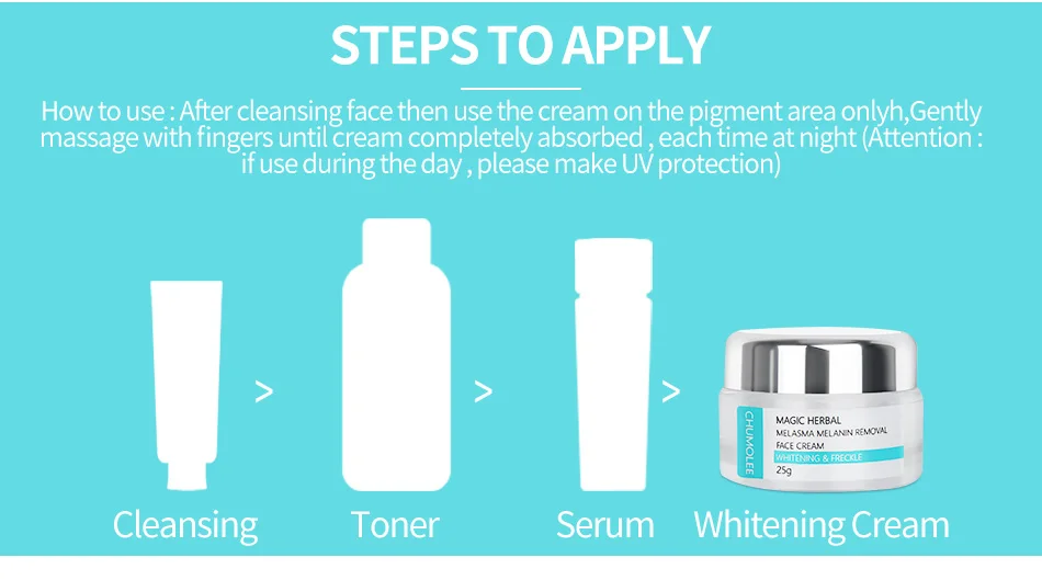 Как использовать:После очищения лица Используйте крем на пигментной области, мягко массируйте пальцами до полного впитывания крема, каждый раз ночью (Внимание: при использовании в течение дня, пожалуйста, сделайте УФ-защиту)