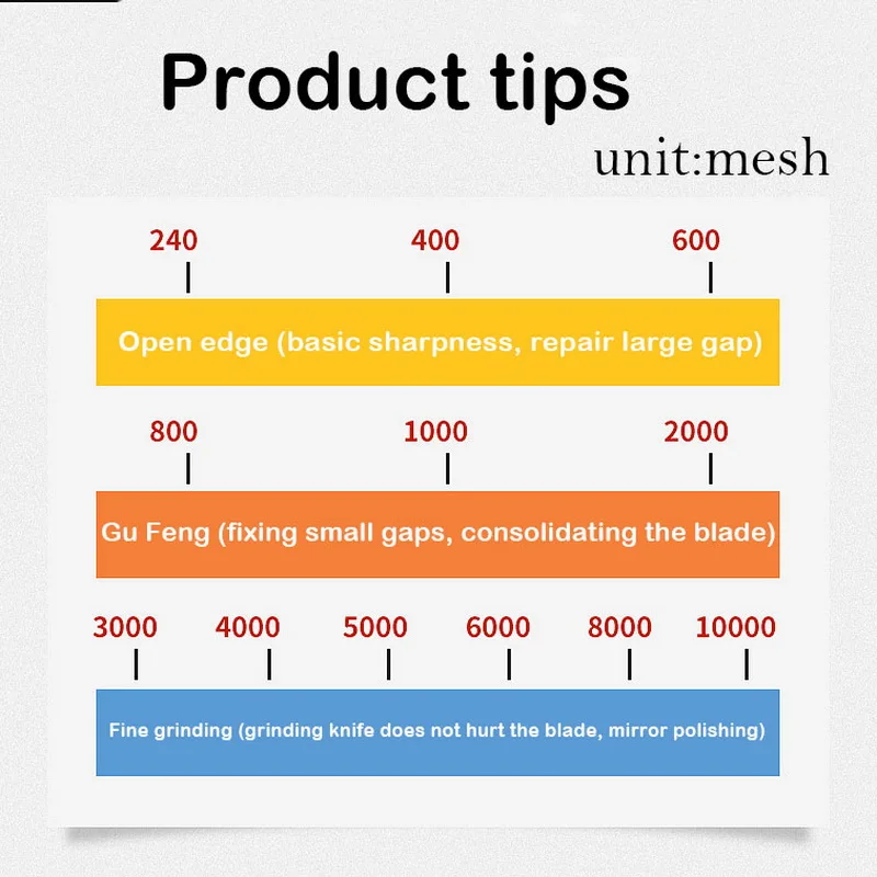 1. Дизайн: 240/800, 400/1000, 600/1500, 1000/3000, 1000/4000, 1000/6000, 2000/5000, 3000/8000, 5000/10000 зернистость двухсторонняя заточка камня.