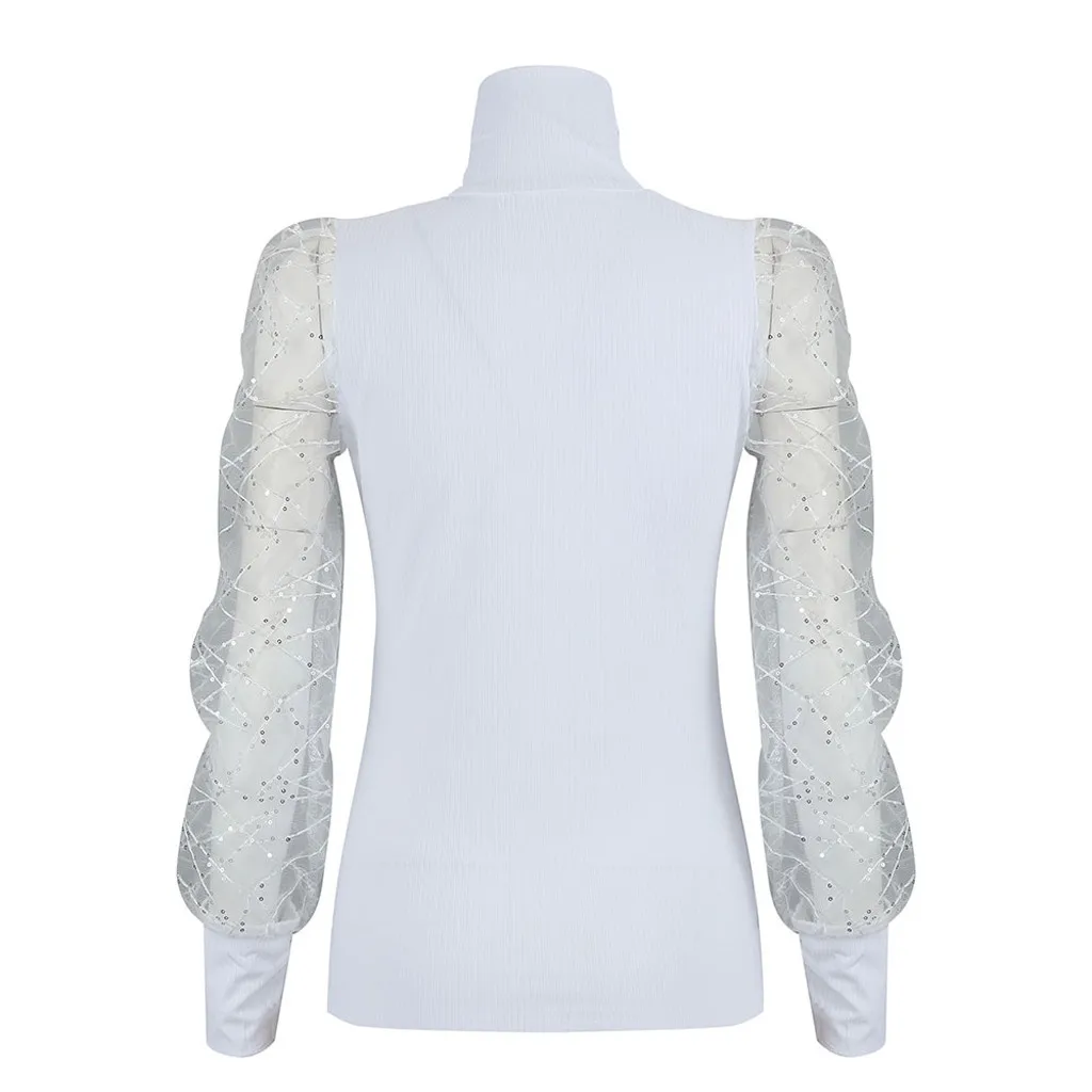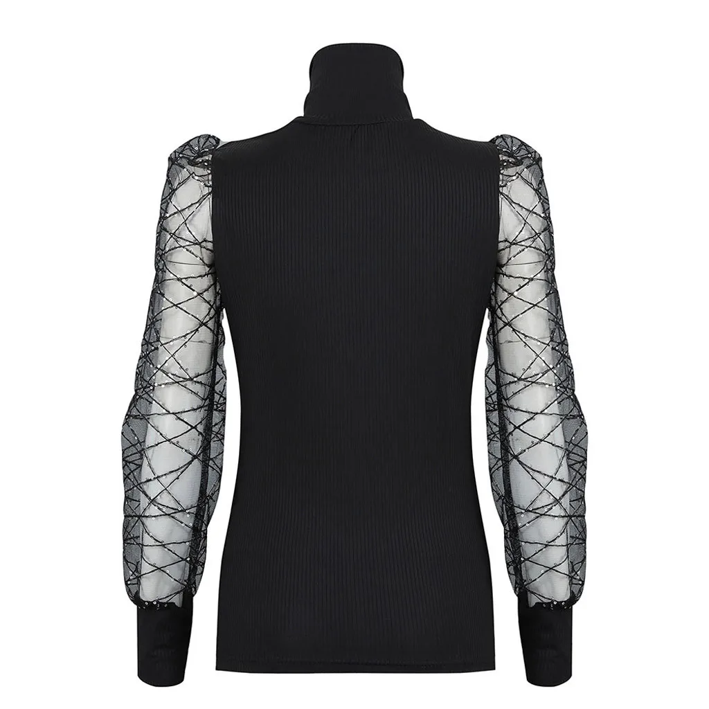 1. Особенности: повседневные топы, круглый вырез, пайетки, пышные рукава, длинный рукав, пуловер, футболка, перспективная сетка, повседневные топы, повседневная одежда, стильный и модный дизайн, осенняя Повседневная блуза.