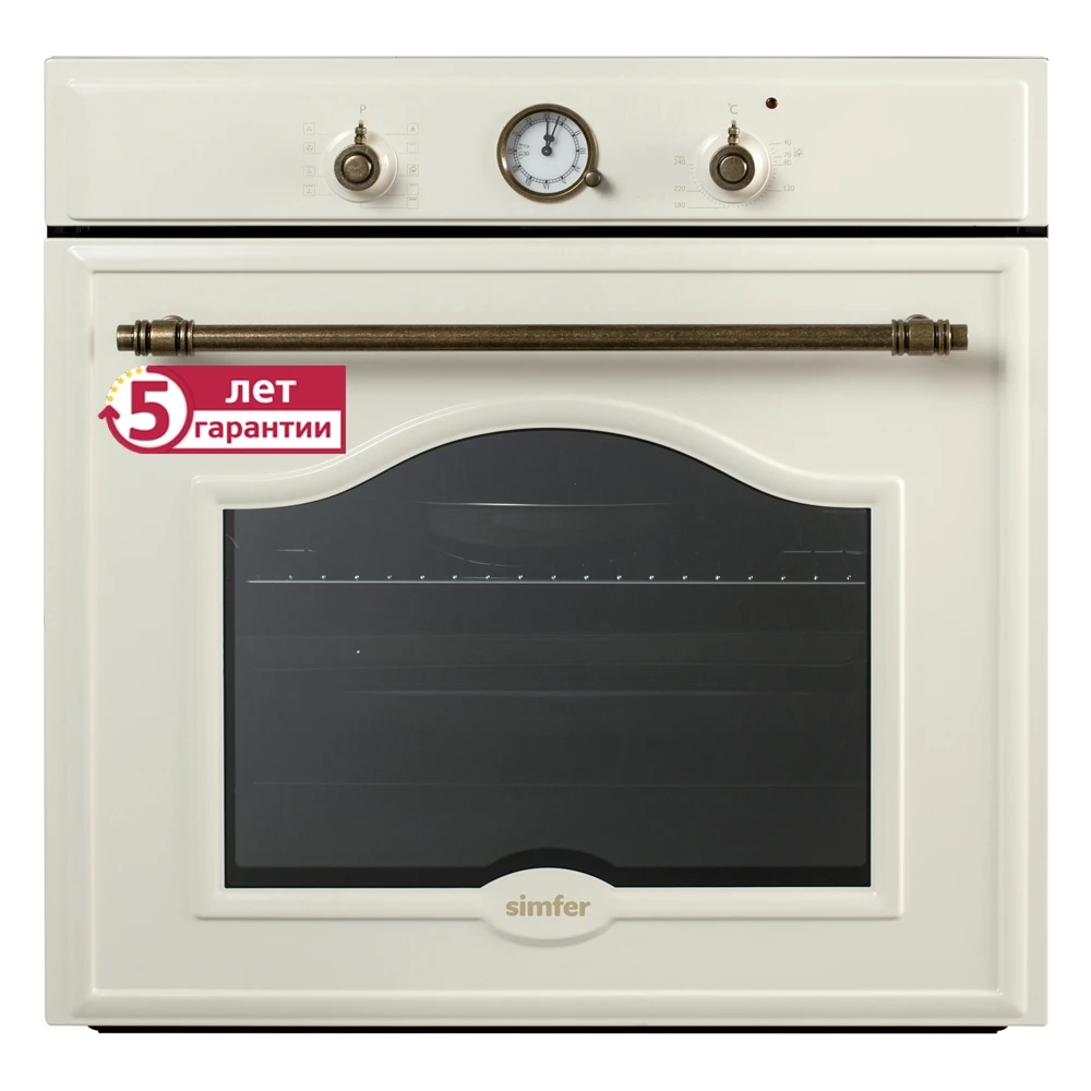 Электрический духовой шкаф Simfer B6EO77097 в RETRO стиле под бронзу - современная техника для кухни, которая благодаря многообразию режимов, позволяет готовить не только повседневную пищу, но и изысканные блюда. Она снабжена функцией конвекции, которая равномерно распределяя теплый воздух, пропекает блюдо со всех сторон. Функция гриль - придаст блюду золотистую хрустящую корочку. С помощью удобных поворотных ручек легко выбрать необходимый режим приготовления для любого рецепта. Встроенная подсветка позволит наблюдать за процессом, не открывая при этом дверцу шкафа, а значит сохраняя тепло внутри.Таймер подскажет, когда блюдо будет готово, а двойное стекло защитит от ожога при случайном прикосновении к дверце шкафа. Эта простая в управлении, стильная и современная техника прекрасно впишется как в классический интерьер, так и в самый современный.