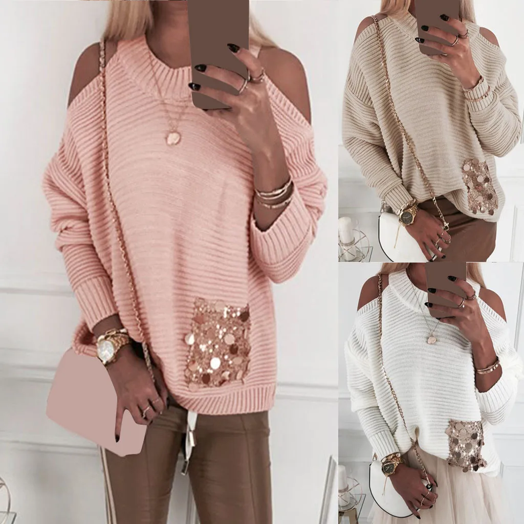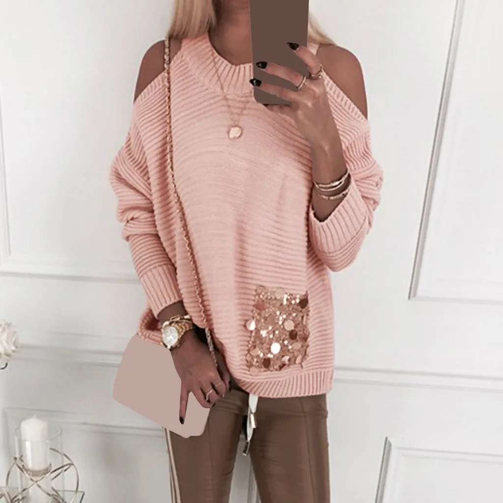 Для женщин однотонные Свитер с длинными рукавами, расшитый блестками