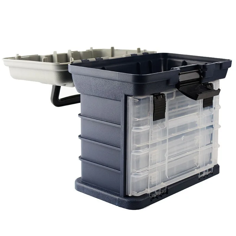 Встроенные 4 прозрачных вставных ящика, вы можете положить некоторые маленькие кусочки, вы также можете использовать их отдельно, так что нижняя часть рыболовной коробки разделена на одно целое, дальнейшее расширение его пространства использования.