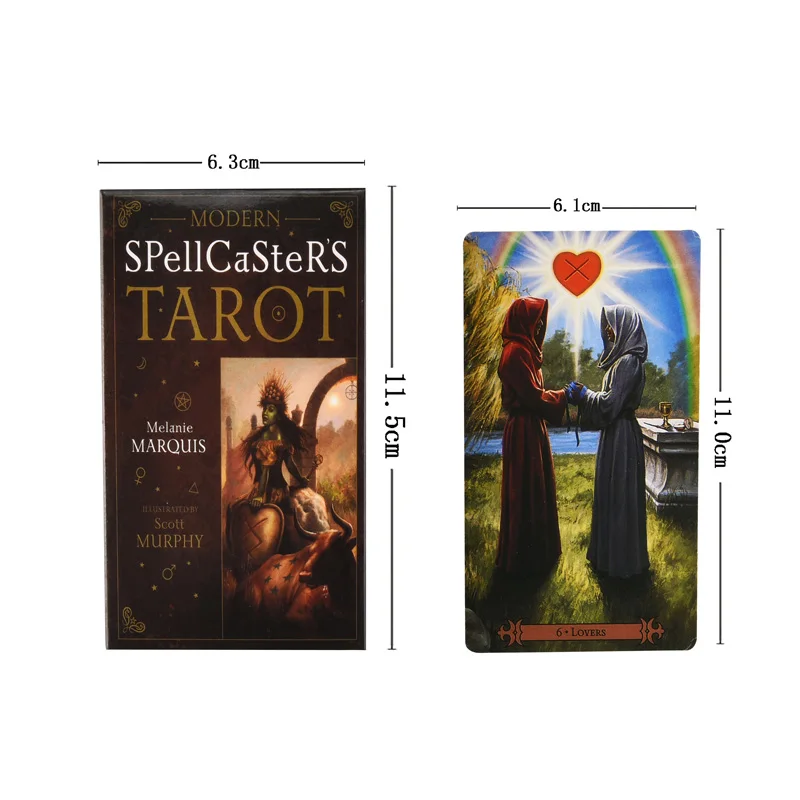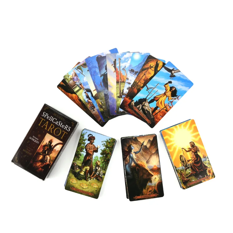 Современный Таро для Spellcaster Карты: 78 шт. Язык: английский Размеры: 11,0*6,1 см (4,33 * 2.4in) Вес: около 150 г Богатый классической символикой и живой с чудесными деталями и цветом, современный Таро Spellcaster является идеальным выбором для улучшения вашей божественной и волшебной практики. Потрясающее художественное произведение Скотта Мерфи демонстрирует знакомые элементы Райдера-вайта в смелом новом стиле с древними языческими мифами, разнообразными этническими особенностями и практическими spellwork.