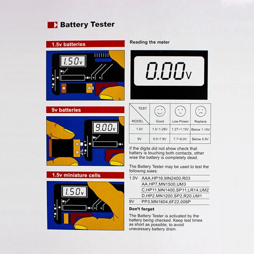 Спецификация: Батарея Размеры: 1,5 V | 9V Хорошо: 1,5 V ~ 1,28 V | 9V ~ 7,8 V Низкая мощность: 1,3 V ~ 1,15 V | 7,8 V ~ 6,3 V Заменить: ниже 1,15 V | Ниже 6,3 V Размер: прибл. 110x60 мм/4,3 "x 2,4" Примечание: Для 1,5 V и 9V аккумулятор и зарядное устройство считывать ЖК-дисплей. Для 1,5 V Миниатюрный клетки, считывать ЖК-дисплей. Если ЖК-дисплей не отображается, проверьте, что аккумулятор соприкасается с двумя контактами, прежде чем считать, что он полностью выключен. Этот тестер батареи активируется проверяемой батареей. Храните время тестирования как можно короче, чтобы избежать ненужного слива батареи.