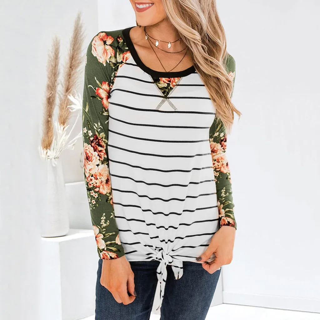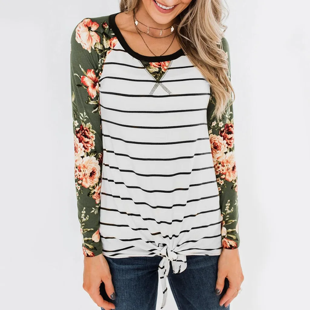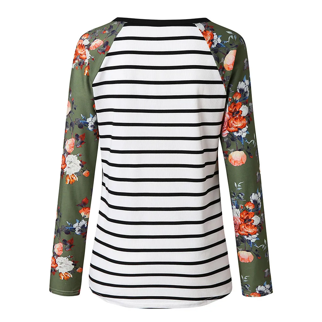 Женская мода цветочный полосатый сплайсинга футболка тройник круглый воротник Топ Блузка