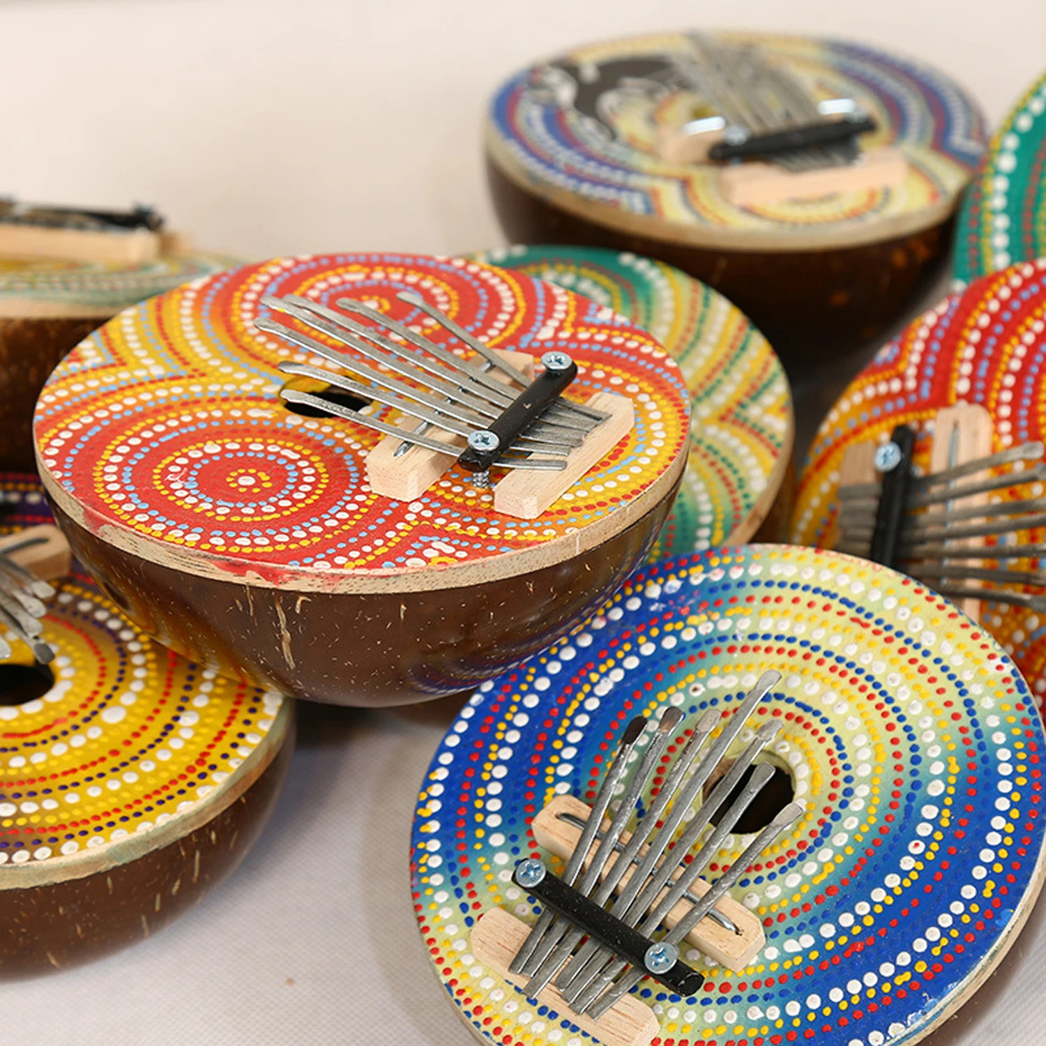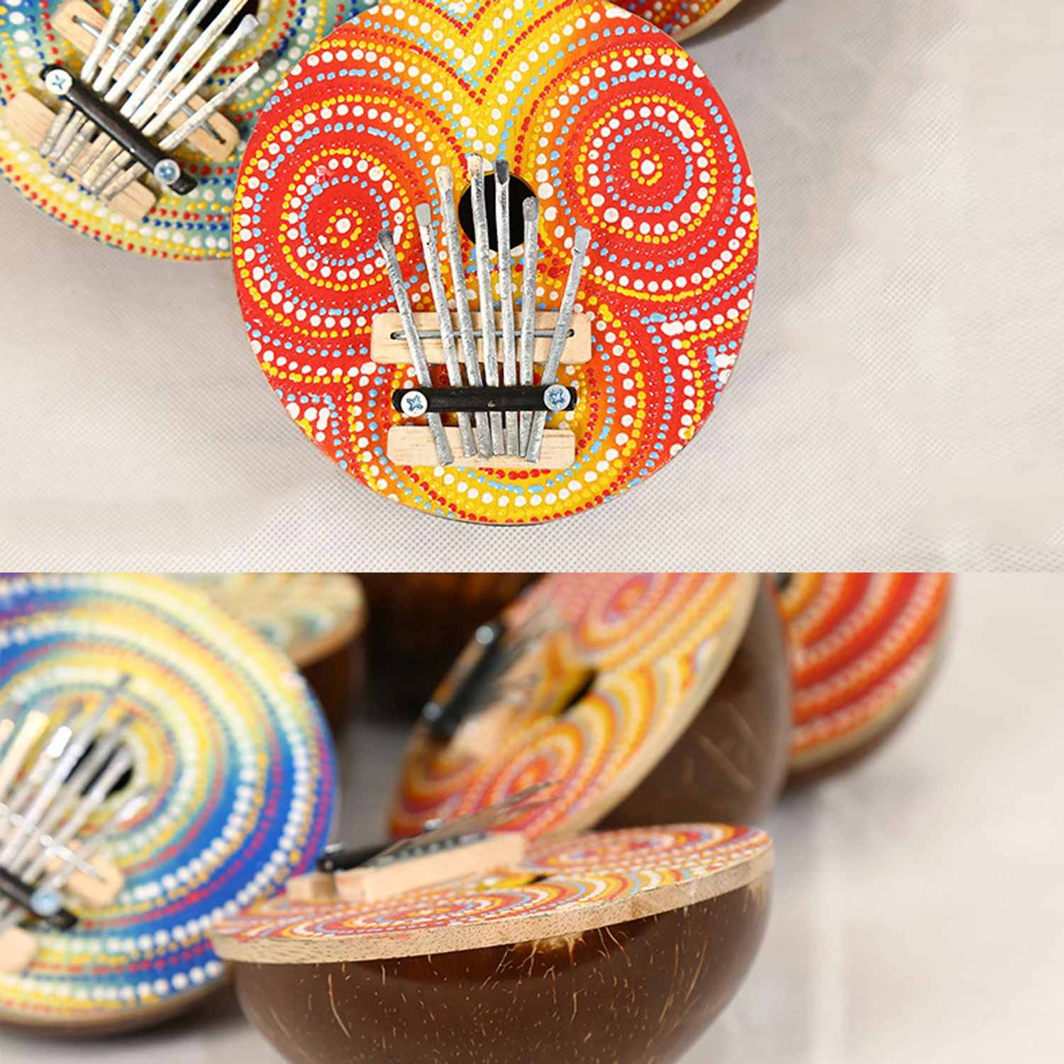 Металлические ключи калимбы крепятся на ящик из твердой древесины, который выступает в качестве резонансной камеры.