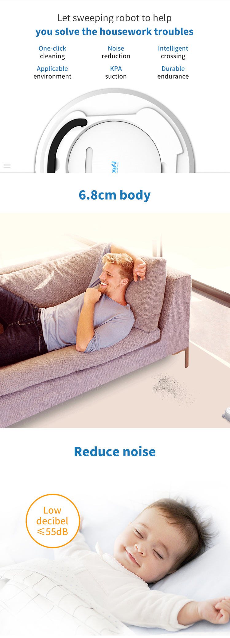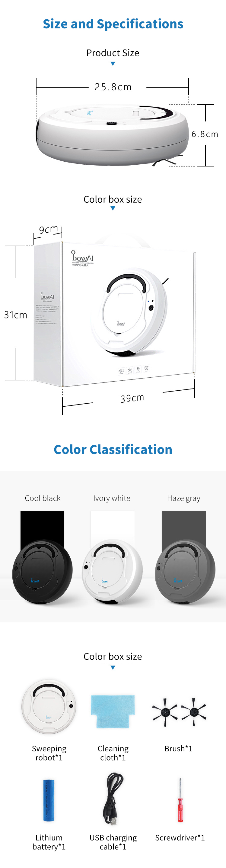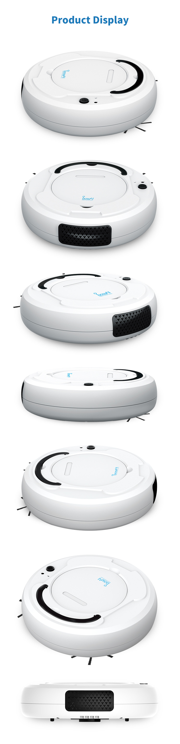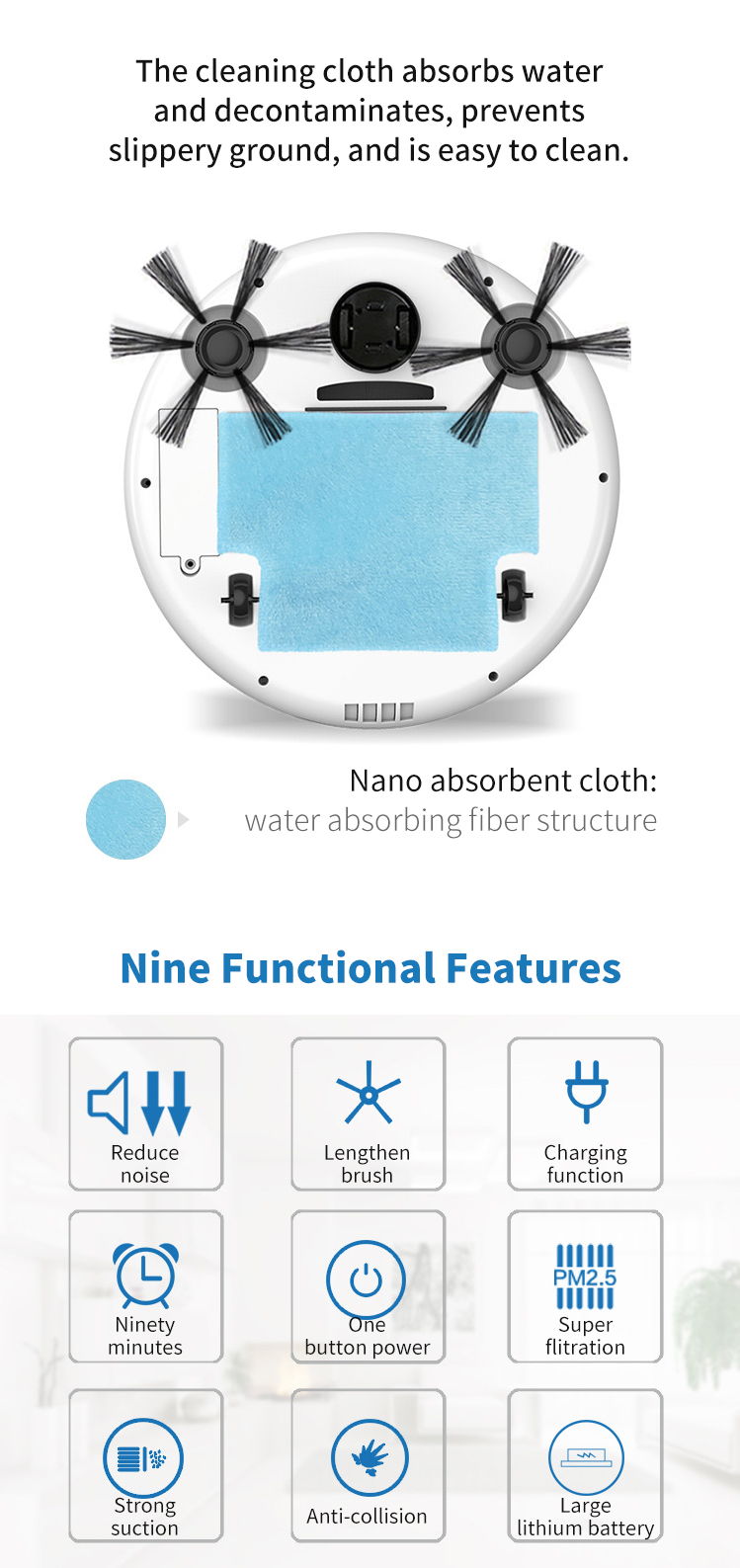 Одна кнопка для запуска, удобная и быстрая 6,8 см стройное тело, легко перейти в нижней части Подходит для земли: плоская поверхность (мрамор, плитка, деревянный пол и т. д.) Очистка мусора: сажа, раковина дыни, закуска мусора, пыли, волос, опилок Ткань для очистки поглощает воду и деконтаминаты, предотвращает скольжение и легко чистится. Прочный, однокнопочный запуск, умная езда, сильное всасывание, тихий и экологически чистый, длительный срок службы батареи 100-150 квадратных метров квартиры могут быть легко очищены в течение одного часаПараметры