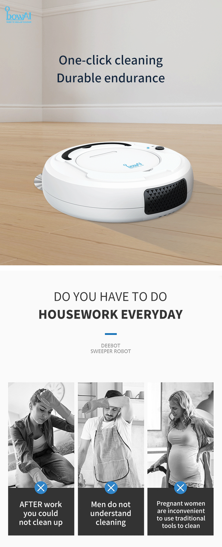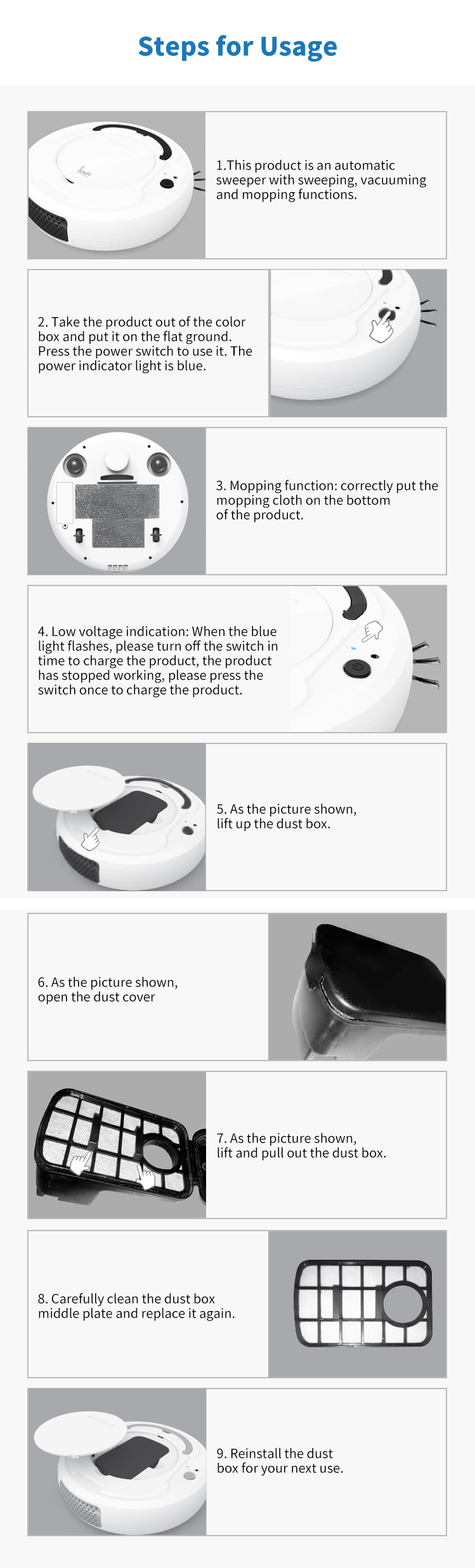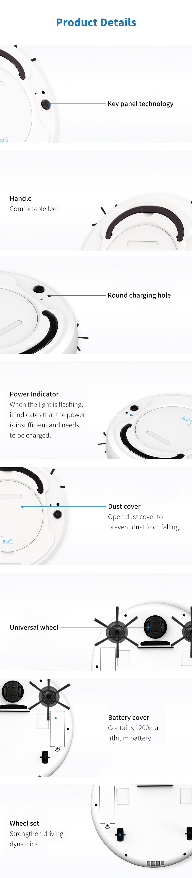 Одна кнопка для запуска, удобная и быстрая 6,8 см стройное тело, легко перейти в нижней части Подходит для земли: плоская поверхность (мрамор, плитка, деревянный пол и т. д.) Очистка мусора: сажа, раковина дыни, закуска мусора, пыли, волос, опилок Ткань для очистки поглощает воду и деконтаминаты, предотвращает скольжение и легко чистится. Прочный, однокнопочный запуск, умная езда, сильное всасывание, тихий и экологически чистый, длительный срок службы батареи 100-150 квадратных метров квартиры могут быть легко очищены в течение одного часаПараметры