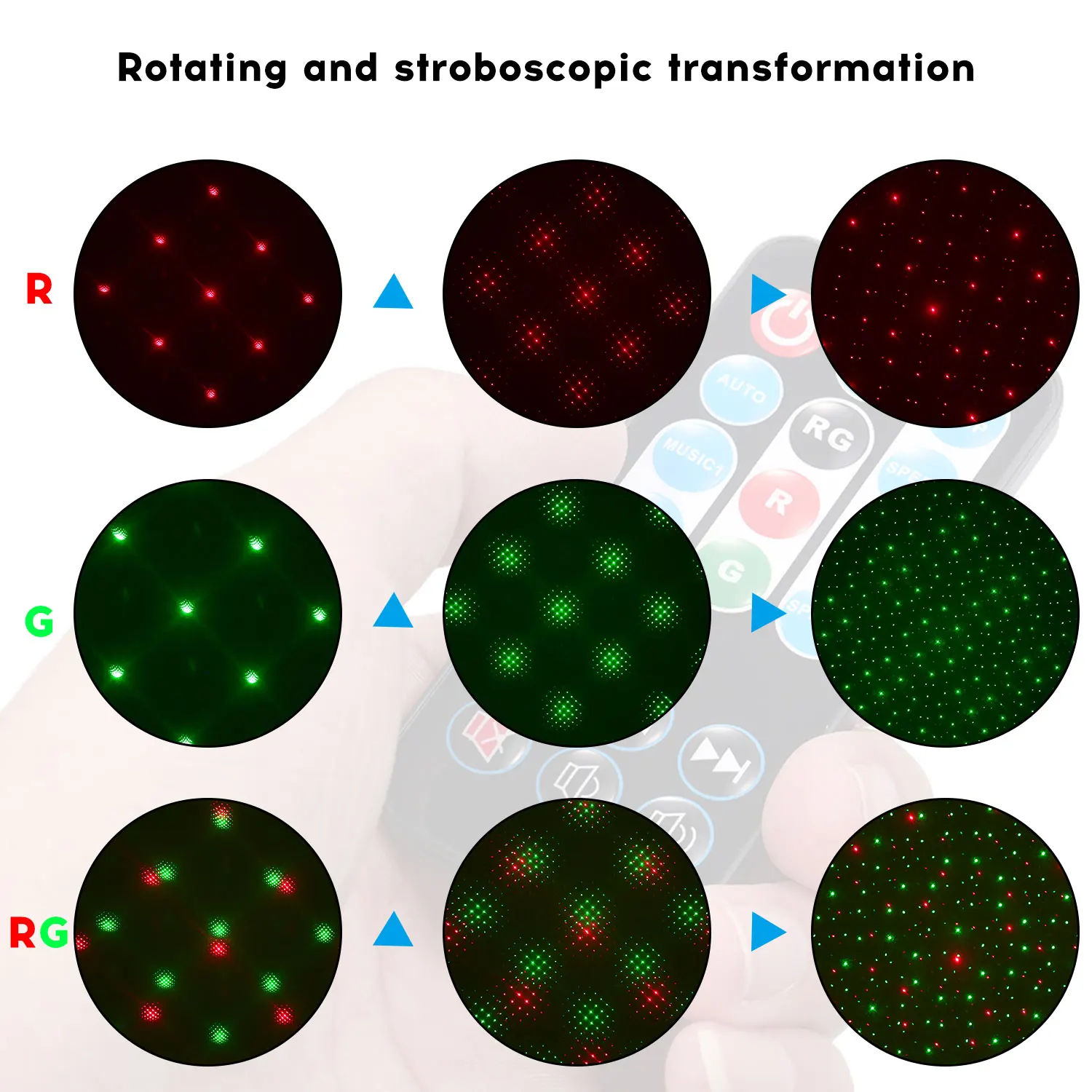 Режим работы: Голосовая активация, автоматический запуск, стробоскоп, трансформация программы, регулировка скорости