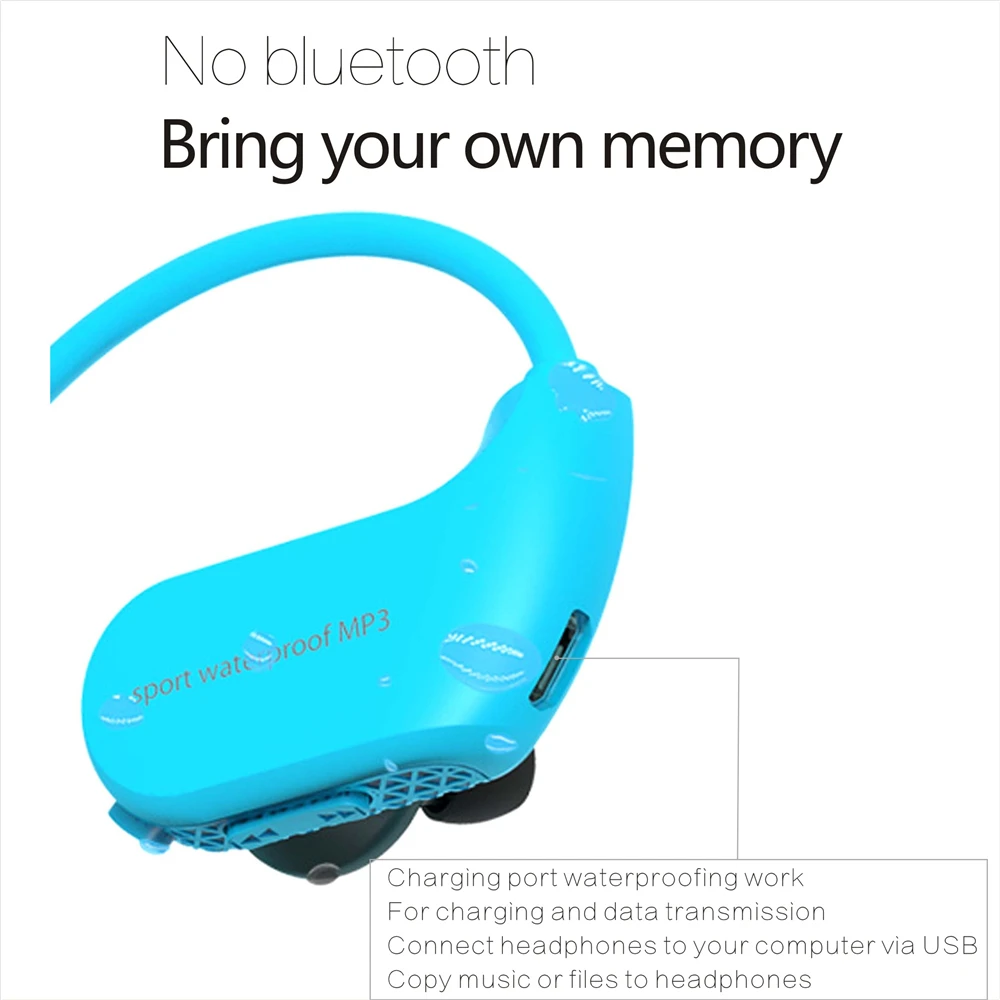 Особенность: класс водонепроницаемости высокой глубины IPX8 подходит для плавания и очередных водных движений. Пыленепроницаемая, устойчивая к холодам/жарким погодным условиям мягкая и удобная гарнитура длительное время воспроизведения музыки до 8 часов объем памяти 4 ГБ/8 ГБ для MP3 песен.