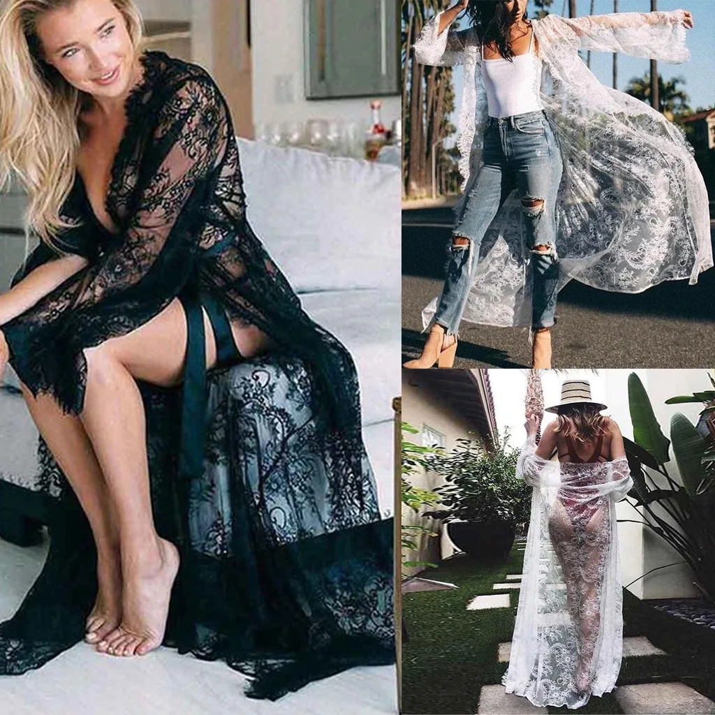 Этот кружевной халат полностью состоит из цветочного кружева и сетки, он очень прозрачный, идеально и сексуально подчеркивает ваше тело