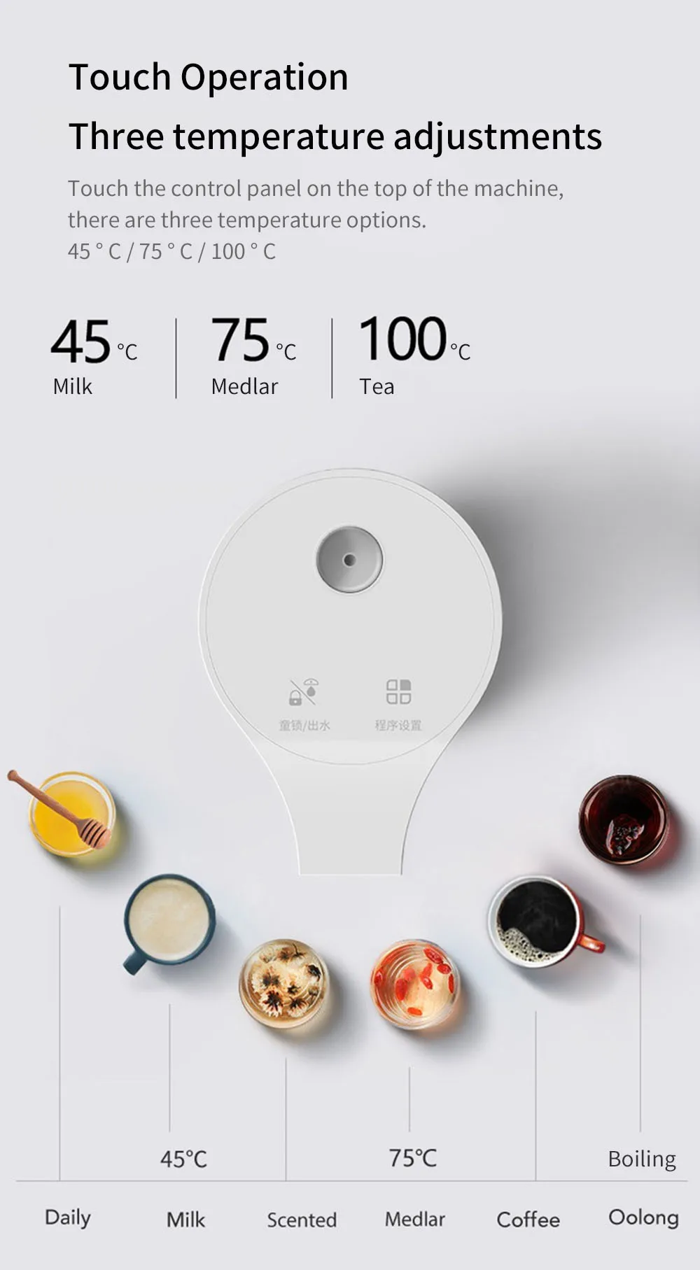 Прикоснитесь к панели управления на верхней части машины, есть три варианта температуры 45 ° C / 75 ° C / 100 ° C