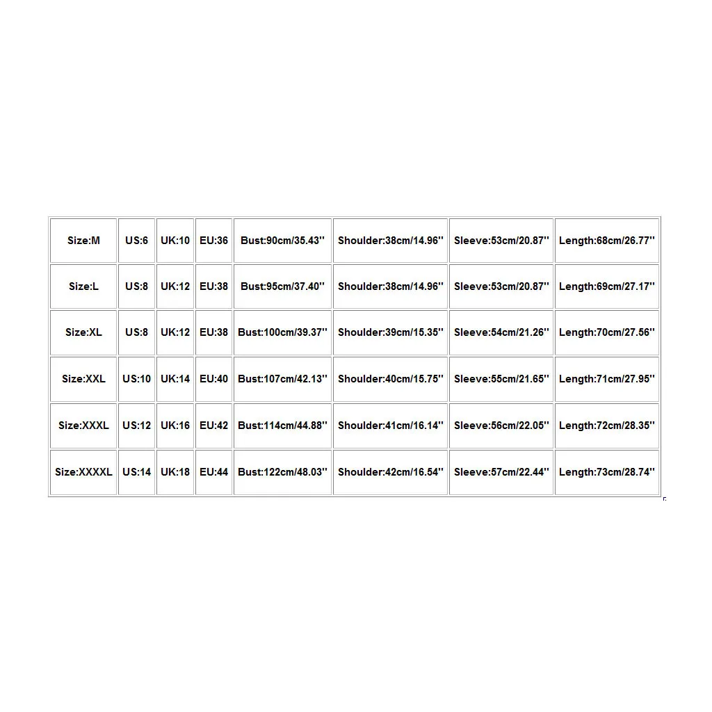 Size US UK EU Bust Shoulder Sleeve Length M 6 10 36 90cm/35.43'' 38cm/14.96'' 53cm/20.87'' 68cm/26.77'' L 8 12 38 95cm/37.40'' 38cm/14.96'' 53cm/20.87'' 69cm/27.17'' XL 8 12 38 100cm/39.37'' 39cm/15.35'' 54cm/21.26'' 70cm/27.56'' XXL 10 14 40 107cm/42.13'' 40cm/15.75'' 55cm/21.65'' 71cm/27.95'' XXXL 12 16 42 114cm/44.88'' 41cm/16.14'' 56cm/22.05'' 72cm/28.35'' XXXXL 14 18 44 122cm/48.03'' 42cm/16.54'' 57cm/22.44'' 73cm/28.74''
