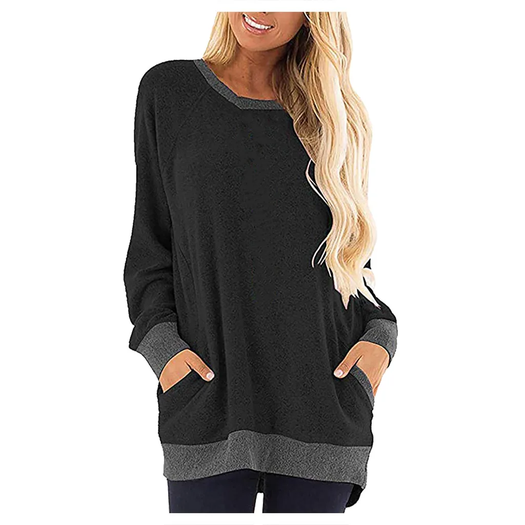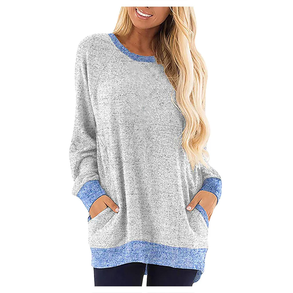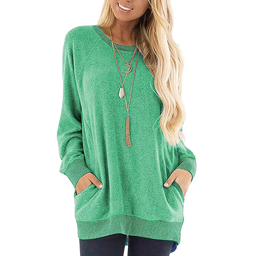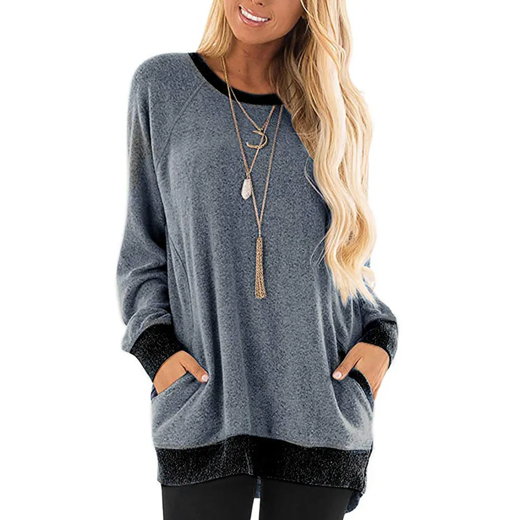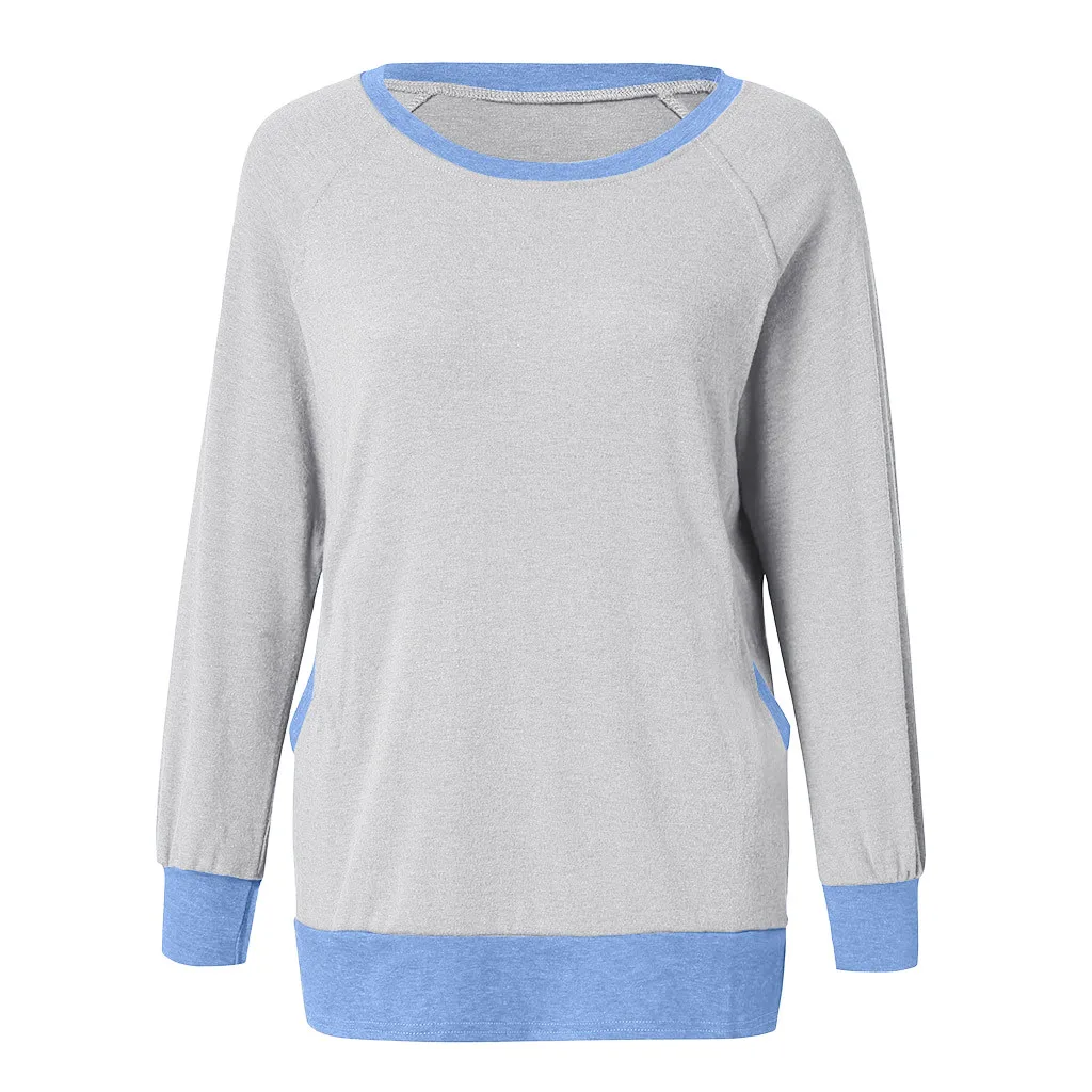 Женская цветная футболка с круглым вырезом и карманом с длинными рукавами; Толстовка; Топы; Блузка