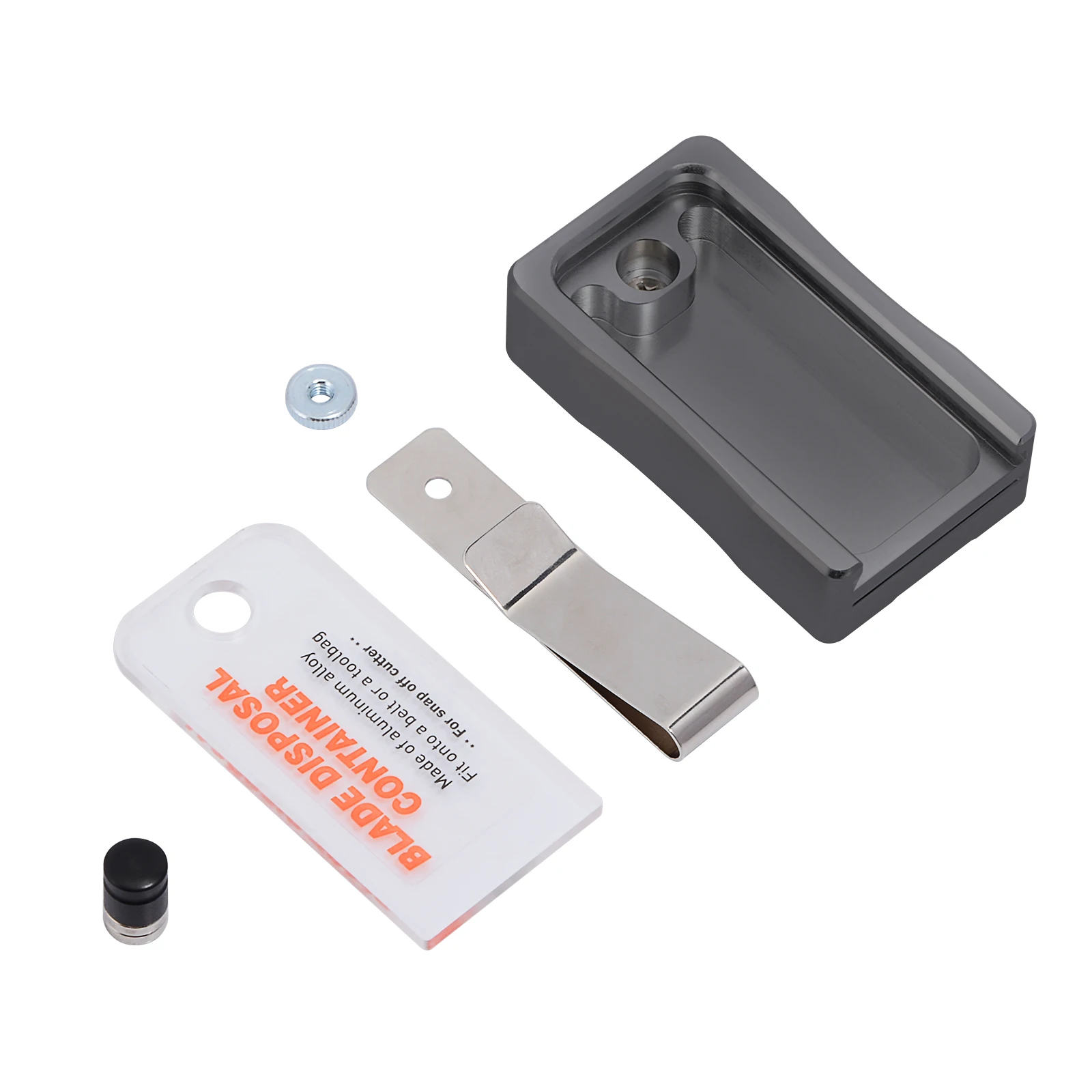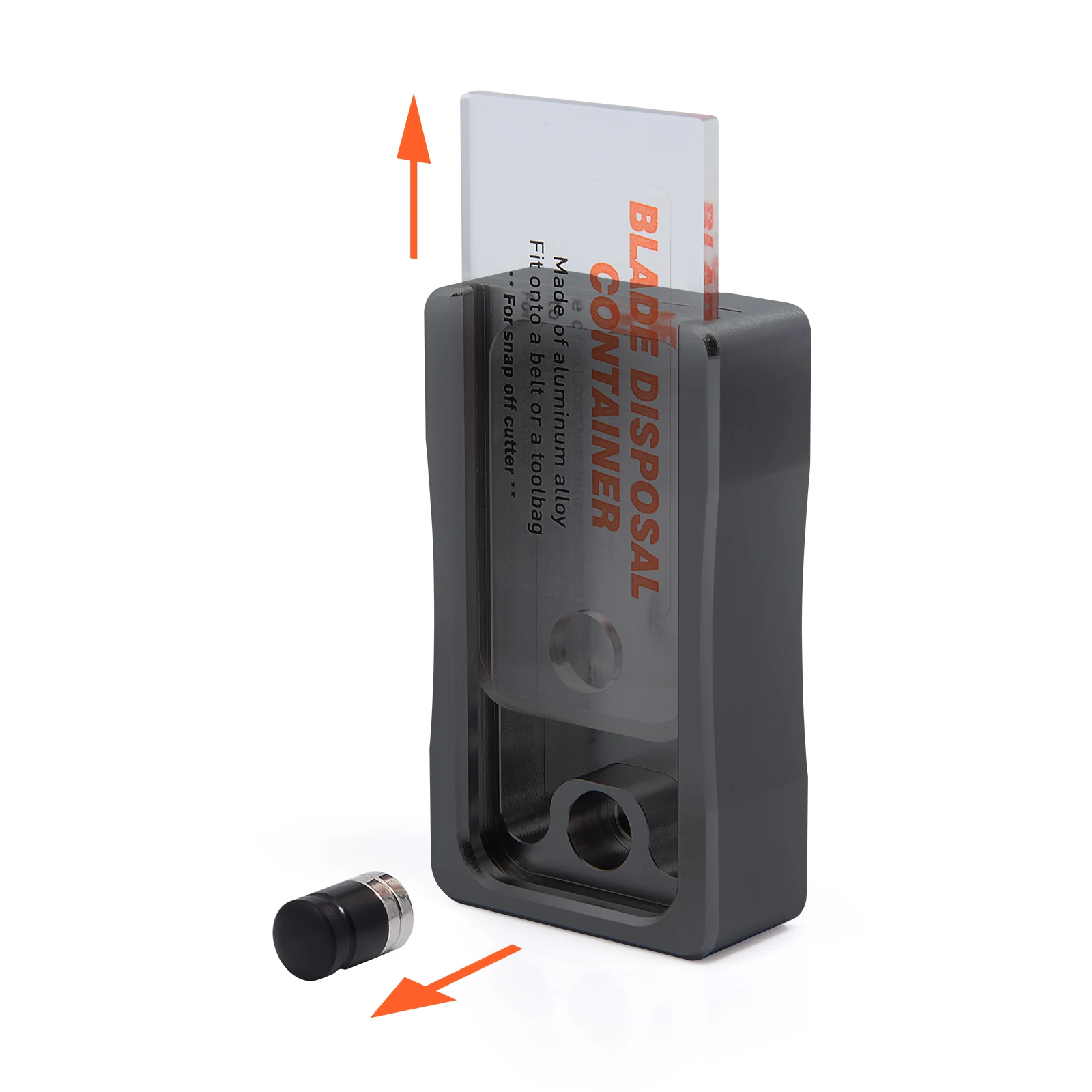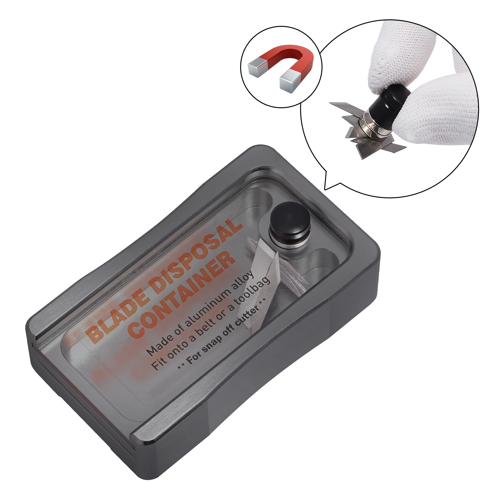 Посылка включает в себя: чехол для удаления лезвия 1 шт. В комплект не входит нож. Параметры 1. Материал: алюминиевый сплав, магнит, пластик 2. Размеры: 3,1*1,8*0,8 дюйма/8*4,6*2 см 3. Применение: для удаления лезвий и хранения использованных лезвий. Особенности 1. Магнитный штекер внутри для безопасного хранения использованного лезвия. 2. Подходит для 0,9-1,8 см в ширину лезвия, прочный алюминиевый сплав для того, чтобы быстро обрыва. 3. Очистите бак лезвия, легко удаляя магнитную вилку. 4. С крючком для удобной переноски.