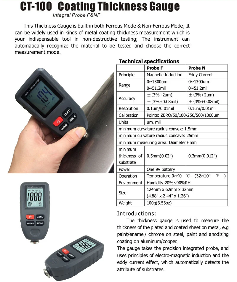 Общее описание: Толщиномер используется для измерения толщины покрытого и покрытого листа на металле, например, краски/эмали/хрома на стали, краски и анодированного покрытия на алюминии/меди. Датчик принимает прецизионный интегрированный зонд, и использует принцип электромагнитной индукции и вихревого тока, который автоматически определяет атрибут субстратов. Датчик предназначен для неразрушающего измерения толщины покрытия и окраски. Он необходим для обработки поверхности материала и широко используется в обрабатывающей промышленности, металлообрабатывающей промышленности, химической промышленности, области Товарной Инспекции, а также может стабильно работать в лаборатории, мастерской и на открытом воздухе.Технические характеристики