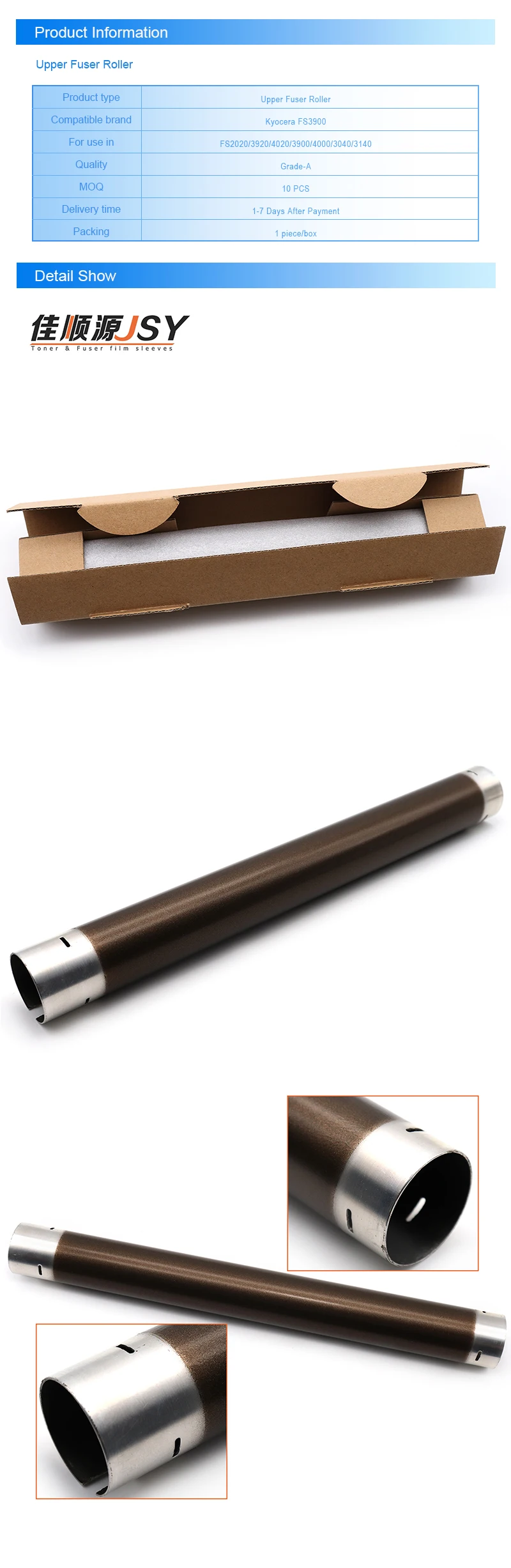 Meishan JSY Printer Material Co,.Ltd. Основанный в 2004 году. Наш офис расположен в Гуанчжоу, Сычуань. Чунцина. Чэнду. Пекинская и промышленная линия расположена в Meishan, мы производим Тонер-порошок и муфту для фузера. Фотобарабан. Ролик пикапа... Поставка всей серии пластиковых пленочных муфт и металлической пленки. Если у вас есть какие-либо вопросы по этой линии, не стесняйтесь обращаться к нам. Мы вас удивим. Наша цель заключается в том, чтобы предоставить конкурентоспособные цены и лучший опыт покупок, насколько это возможно, как мы можем сделать для каждого клиента. Мы стремимся установить долгосрочные деловые отношения с каждому клиенту, за исключением нашего сотрудничества.