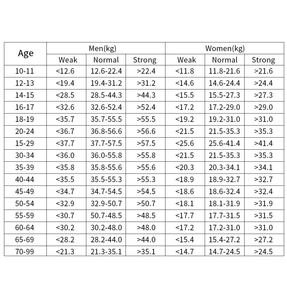 Описание: 1. Цифровой Ручной динамометр спроектирован как профессиональное тренировочное устройство для сильных рук, подходит для любого офиса врача, физиотерапии, инженерной лаборатории или тренажерного зала. 2. Регулируемая Центральная ручка позволяет регулировать устройство для различных размеров и предпочтений руки. 3. 19 определяемых пользователей с вариантами пола и возраста для хранения, а также возможностью сохранения и отзыва результатов тестирования для каждого пользователя. 4. Сравнивает индивидуальные испытания для каждого из 19 пользователей и отображает увеличение или уменьшение по сравнению с последней записью. 5. Каждый пробный цикл оценивается как «слабый», «нормальный» или «сильный» на основе данных по возрасту и полу, введенных для каждого пользователя. 6. Легкий переключатель от фунта до кг. В любое время, в том числе для последних записанных данных.