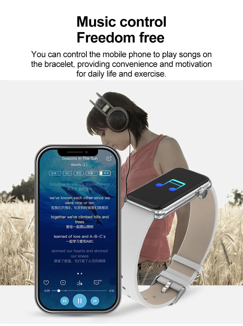 Вы можете управлять мобильный телефон, чтобы играть песни на Браслет, обеспечивающий удобство и мотивацию Для повседневной жизни и физических упражнений.