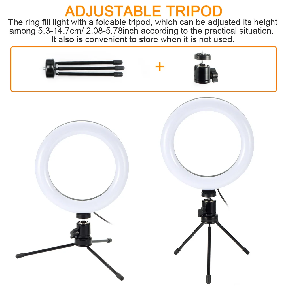 Кольцо для заполнения светильник со складной штатив, который может быть отрегулировано свою высоту между 5,3-14,7 см/2,08-5,78 дюймов в соответствии с реальной ситуации. Также удобно хранить, когда он не используется.