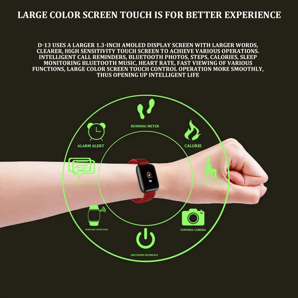 1. С большим 1,3-дюймовым экраном, слова больше, четче, и сенсорный экран с высокой чувствительностью может достичь различных операций. Интеллектуальное напоминание о вызовах, bluetooth-фотография, шаги, калории, мониторинг сна, Bluetooth музыка, частота сердечных сокращений, быстрый просмотр различных функций, большая работа с сенсорным экраном более плавно, с этого момента.