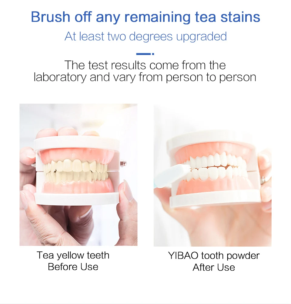 Результаты тестов исходят из лаборатории и различаются в зависимости от человека Чайные желтые зубы перед использованием YIBAO зубной порошок после использования Специально разработано для желтых зубов Заставьте улыбаться с уверенностью