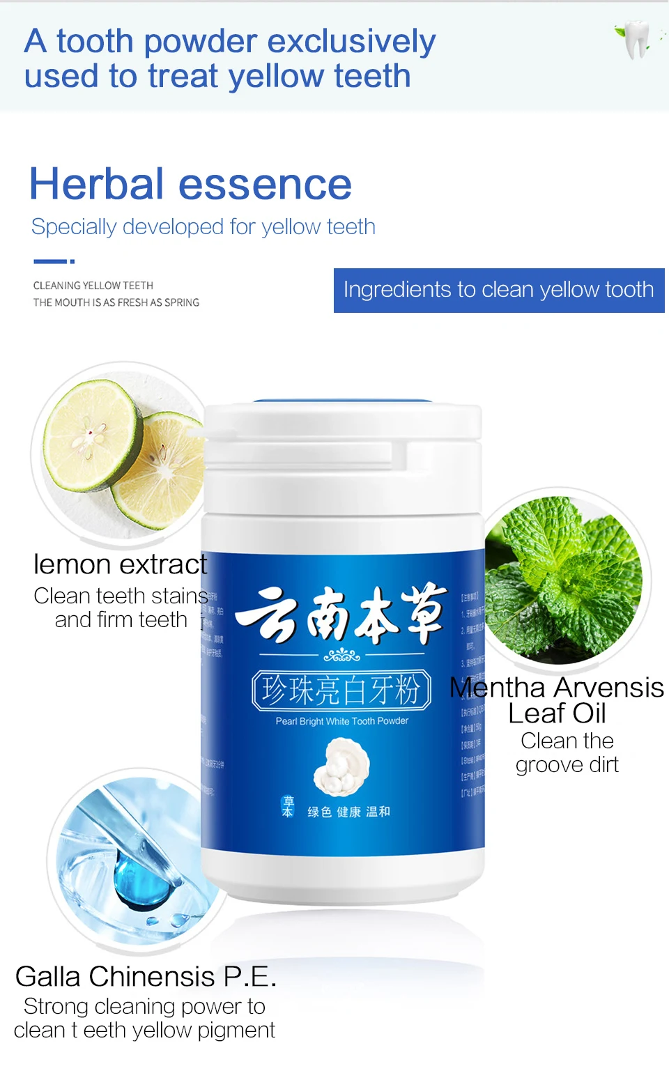 Специально разработано для желтых зубов Свежие и тонкие Частицы Порошка Экстракт жимолости, желчного ореха и других трав